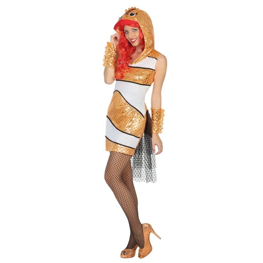 La petite robe poisson-clown dorée pour femme est un vêtement sans manches recouvert de paillettes en imitation écailles.