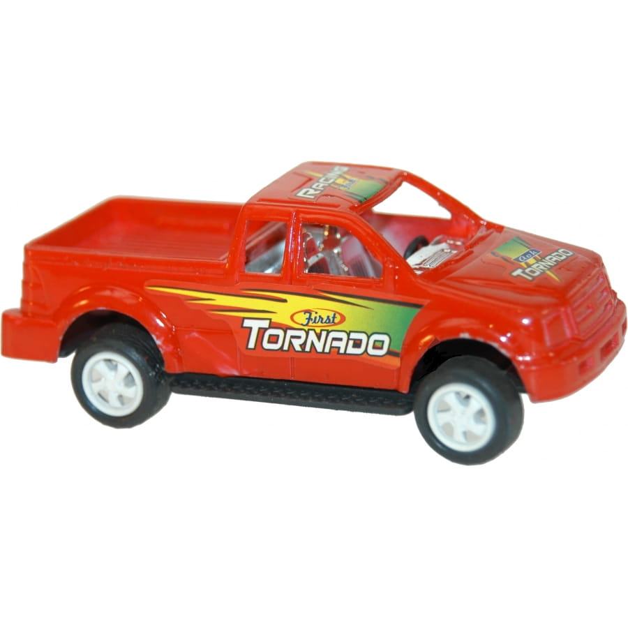 Pick-up Tornado à rétro-friction, mesurant 9.5 centimètres de long. Faites-le reculer sur une bonne distance et relâchez-le pour qu'il avance tout seul. Au moment de la commande, vous ne pourrez choisir ni le modèle ni la couleur du pick-up et le recevrez comme présenté. Il est parfait si votre enfant est adepte de voitures.
