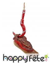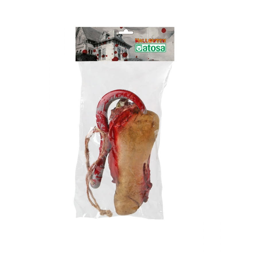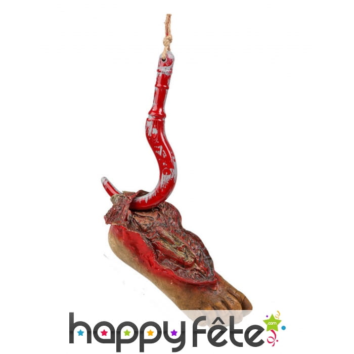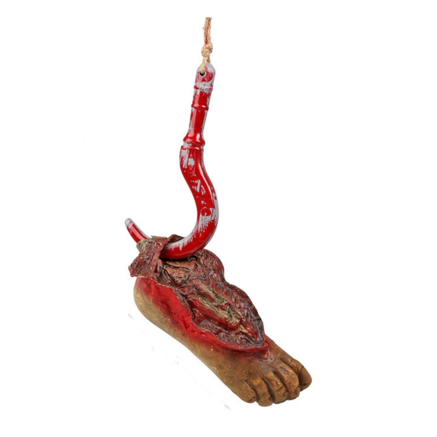 Vous pourrez le suspendre aisément en y attachant un lien au sommet du crochet métallisé rouge qui donne l'impression d'être enfoncé dans la chair de ce pied en pleine putréfaction.