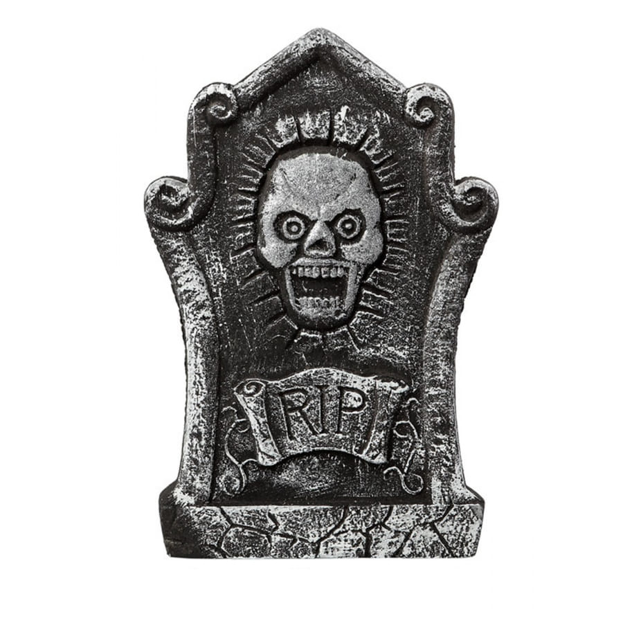 Cette Pierre tombale RIP avec tête de mort de 44 x 30 cm ne manquera pas de souligner votre décoration sinistre lors d'halloween.