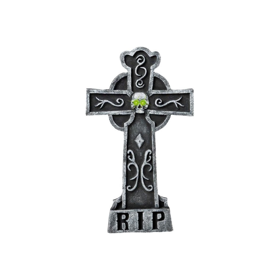 Pierre tombale de couleur grise, avec insigne "RIP" et crâne aux yeux lumineux. Cet accessoire est vendu avec piles et mesure 60 centimètres de haut. Placez-le dans votre jardin pour faire peur à quiconque s'approchera de votre maison le soir d'Halloween.