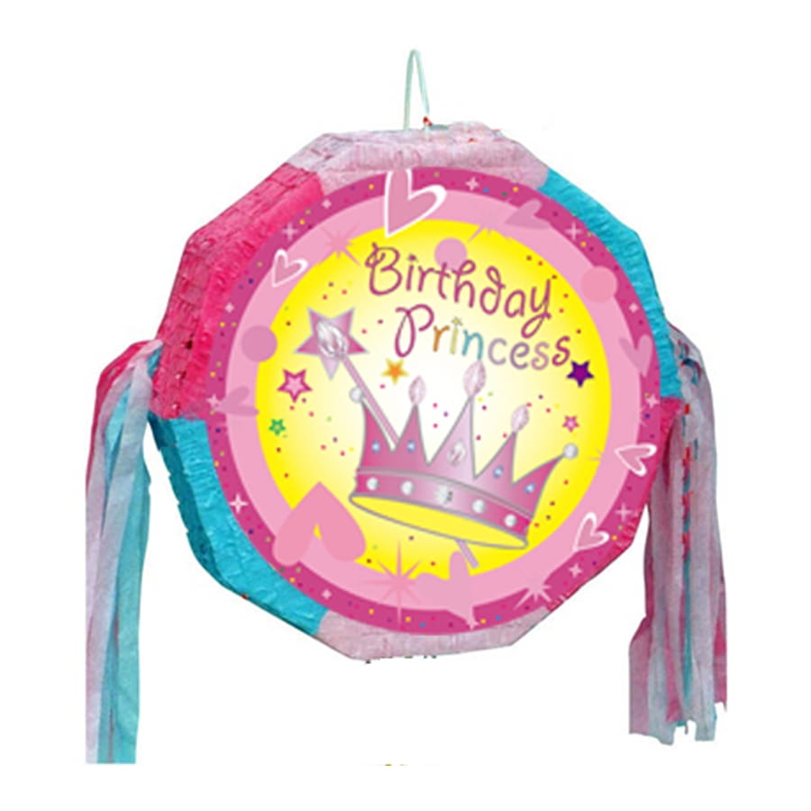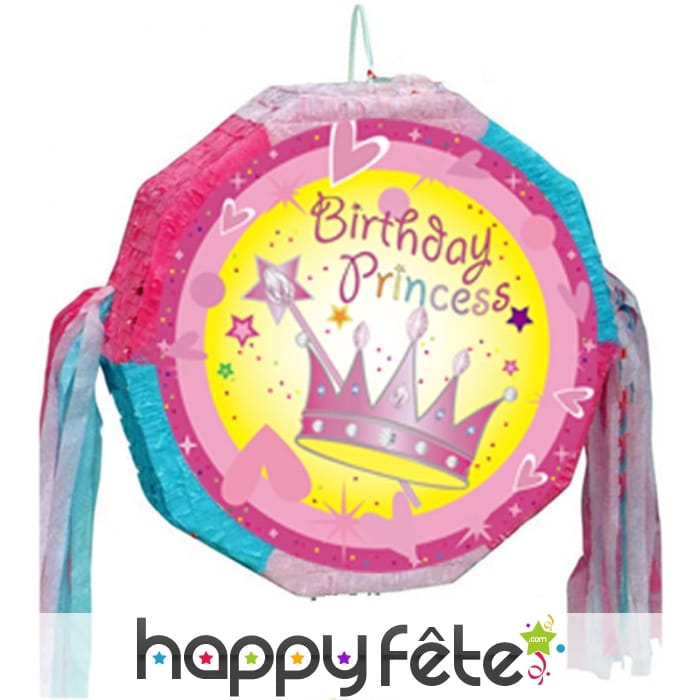 Toutes les pinatas ne se ressemblent pas, et celle-ci est dédiée à une petite princesse pour son anniversaire. Son apparence dit tout : le dessin d'une couronne, quelques étoiles, des confettis et l'inscription "Birthday princess". Cette pinata de forme ronde sera à remplir de jouets, de bonbons, de surprises, et le moment venu, il suffira de tirer sur les flots qui pendent pour faire tout tomber. Elle mesure 50 cm. Livrée vide sans le bâton.