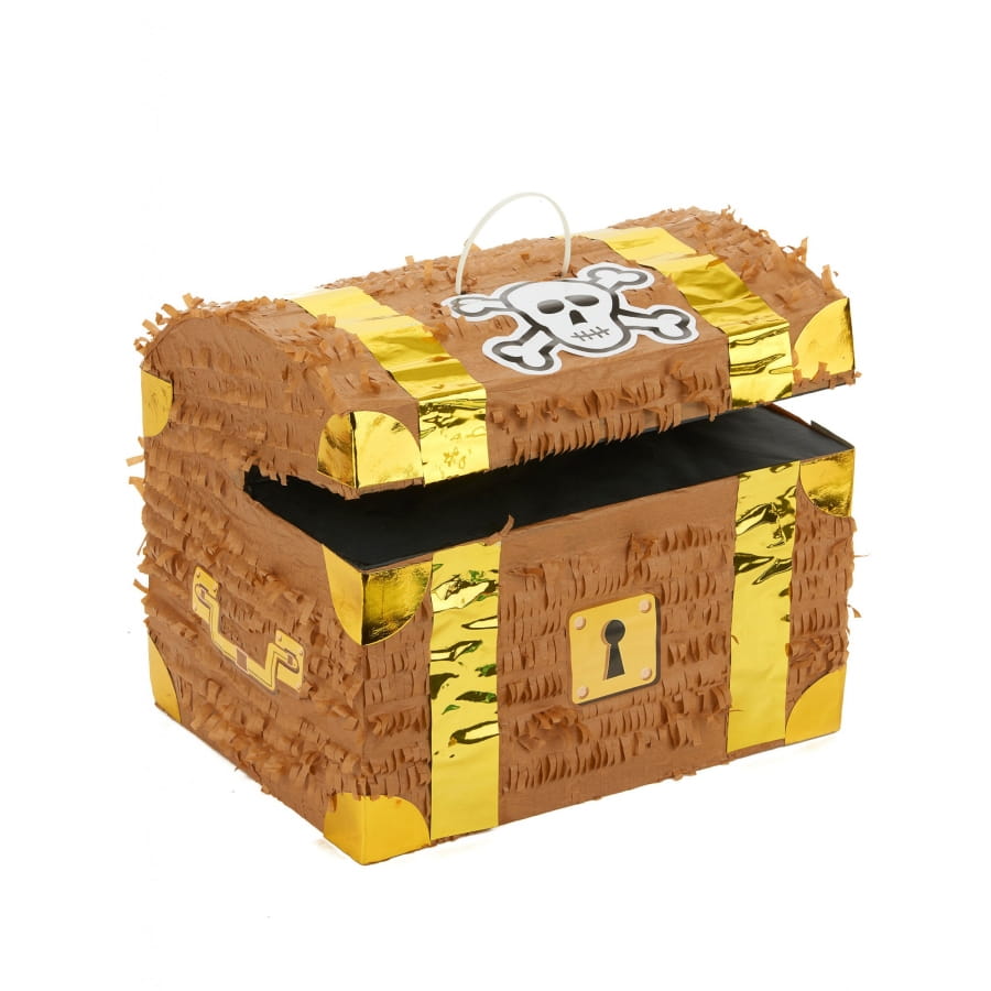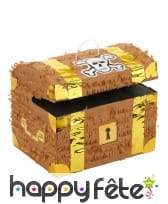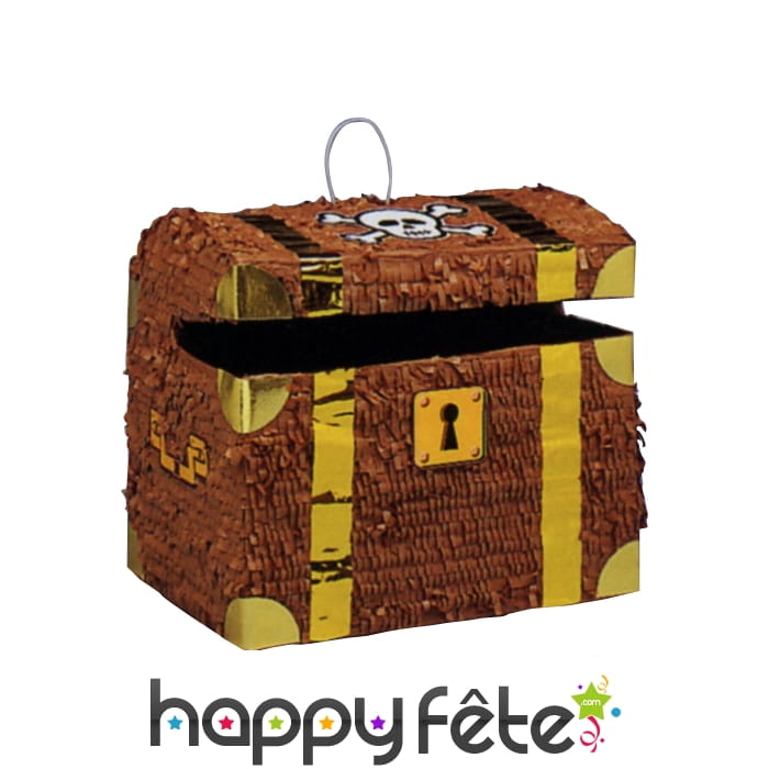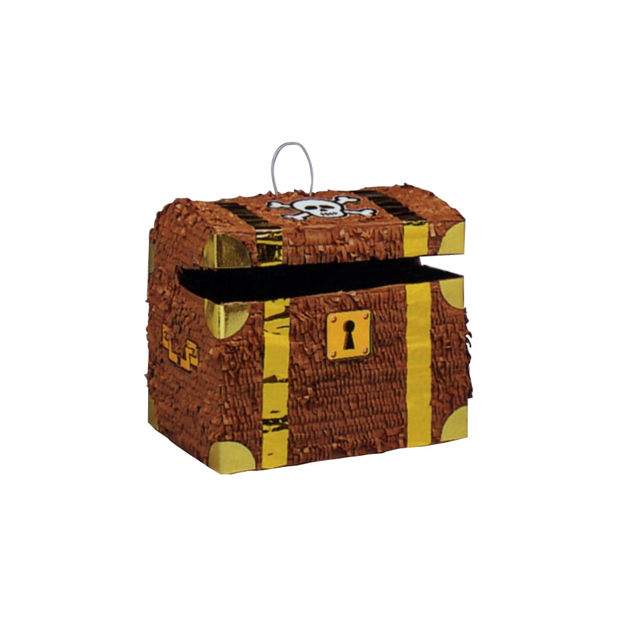 Piñata en forme de coffre de pirate de couleur jaune et marron. La taille de cette piñata est de 30 centimètres. Tous les enfants seront ravis de voir tomber des trésors de cette piñata!