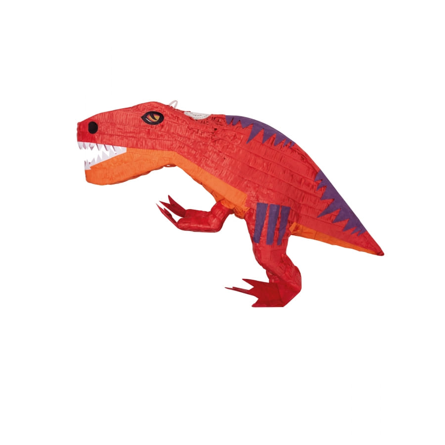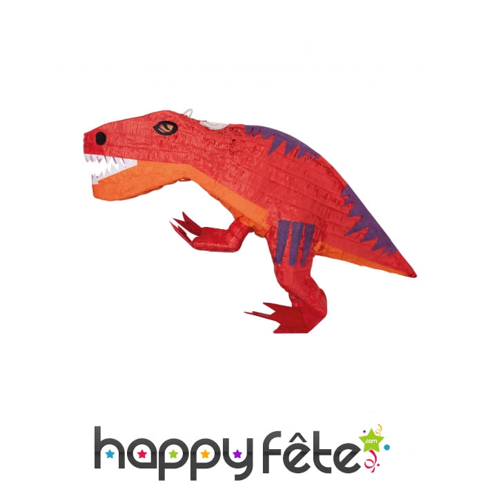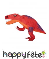 Cette piñata est rouge et représente un tyrannosaure de l'ère du jurassique.
