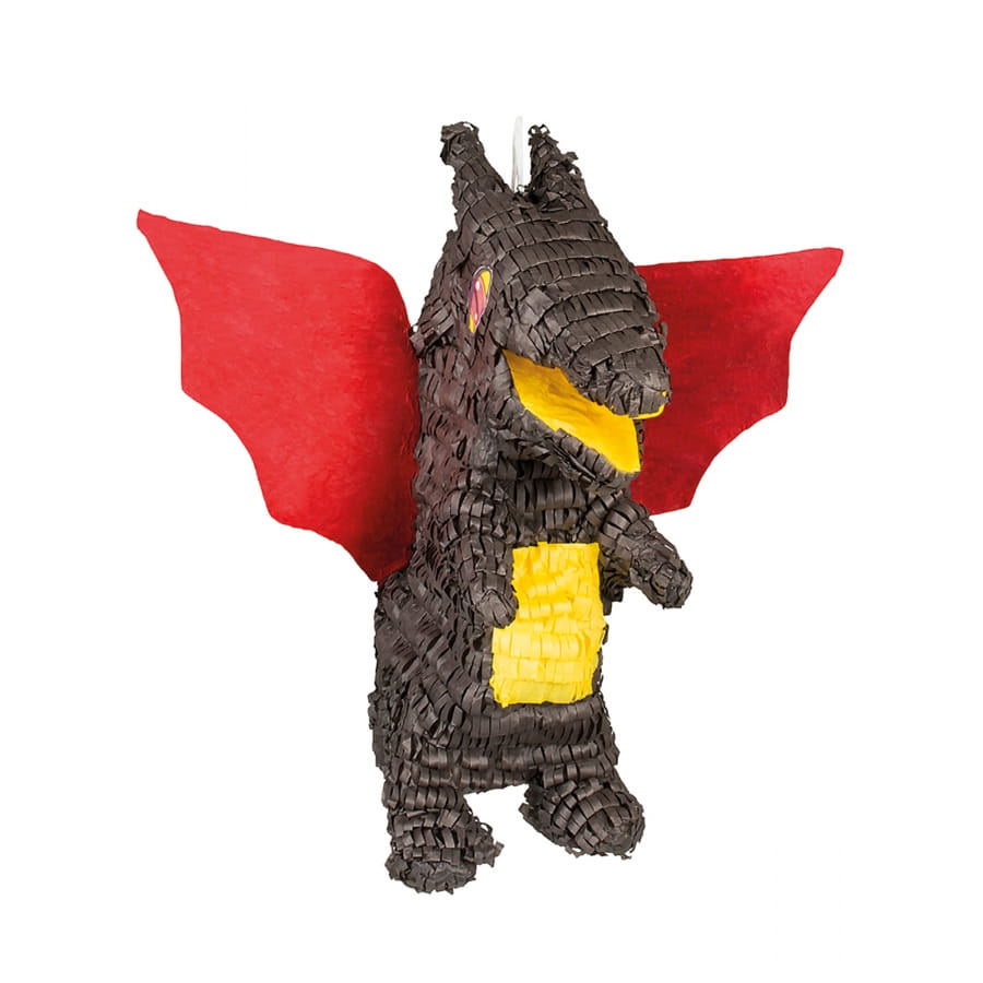 Ce Pinata en forme de dragon est d'une couleur noire. Le dragon possède des ailes rouges ainsi qu'un petit ventre et une bouche jaune.