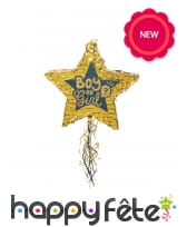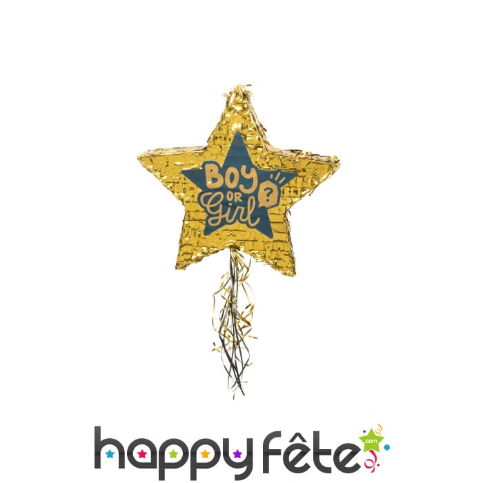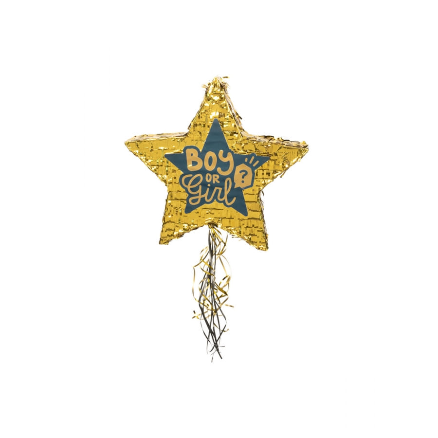 Cette magnifique pinata représente un récipient en forme d'étoile recouverte de franges dorées et brillantes. Au centre de la décoration, on peut lire sur un fond bleu l'expression "Boy or Girl?" en lettres dorées. Le récipient vendu vide est à remplir par des confettis bleus ou roses, selon le sexe de votre bébé.