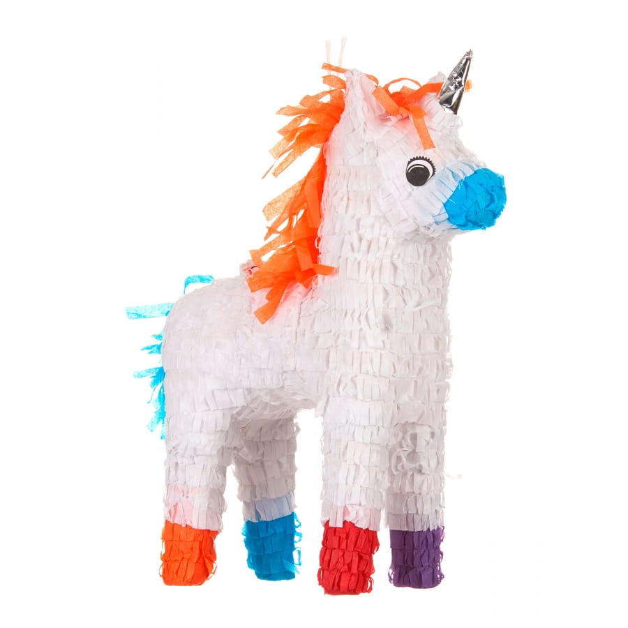 La pinata licorne de 55 cm est en carton et recouverte de franges en papier de soie blanc.