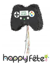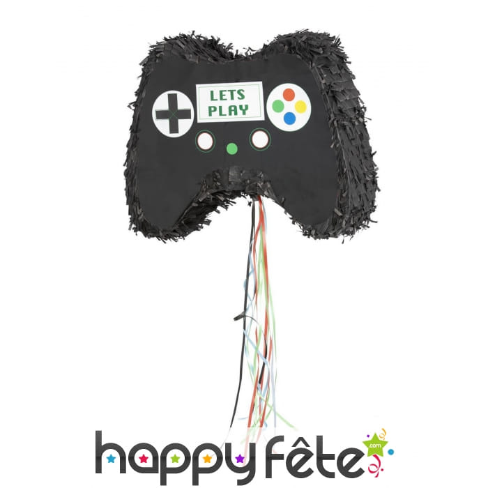 Maintenant, laissez-moi vous plonger dans les détails croustillants. Cette piñata n'est pas juste une piñata ordinaire. Non, non ! Elle a la forme cool d'une manette de jeu, et elle est toute noire avec une inscription en anglais qui dit "let's play". C'est comme si elle vous criait "Venez, cassez-moi et découvrez les trésors cachés à l'intérieur !".