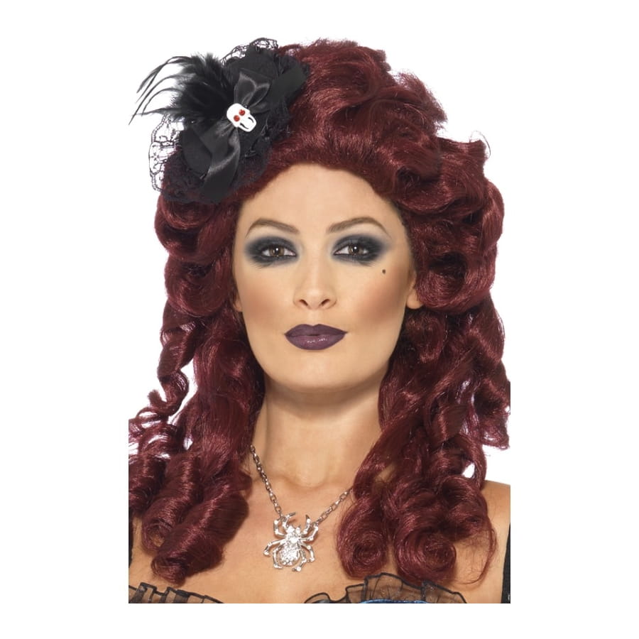 Pince à cheveux pour femme ou adolescente en forme de noeuds et de plumes, avec tête de mort de couleur blanche. Ce superbe accessoire est idéal pour Halloween ou pour un déguisement de dame pirate ou corsaire.