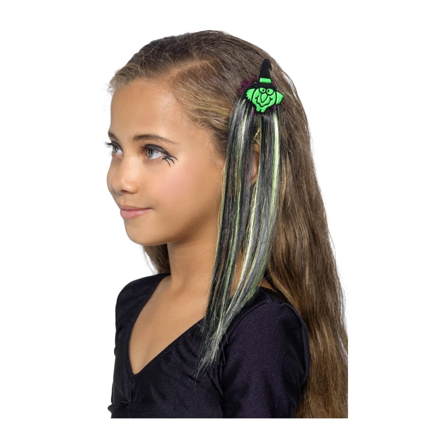Pince à cheveux sorcière pour fille. Cet accessoire est composé d'un petit clip en forme de visage de sorcière de couleur vert fluo et de longues mèches de cheveux noires et vertes. Il sera idéal pour agrémenter la tenue de sorcière de votre enfant à l'occasion d'Halloween.