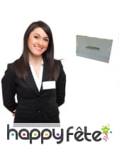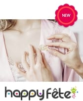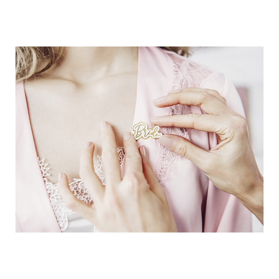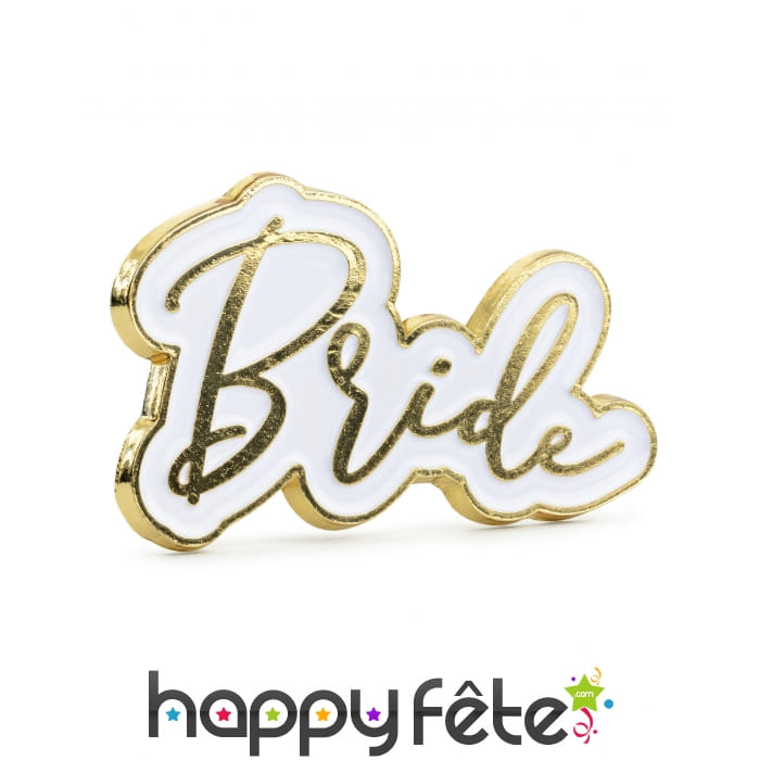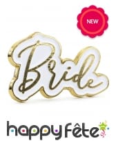 Il mesure 3,5 x 2 cm et possède une bordure dorée qui suit les contours de la calligraphie parfaite du mot "Bride" écrit en lettres dorées sur fond blanc.