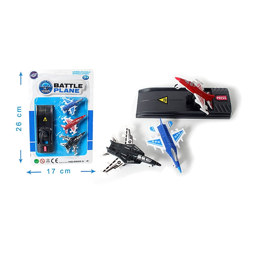 Et c'est parti pour en petit tour en avion ! Vous avez le choix entre trois super jets ultra-rapides. Déposez-les sur la piste de lancement, pressez le bouton, et l'avion décolle ! Ce jeu amusant est fourni dans un blister de 17 x 26 cm de dimension. Il existe divers coloris, mais vous n'aurez pas le choix du modèle ou de la couleur lors de la commande. Cet article sera idéal en tant que premier lot d'une kermesse !