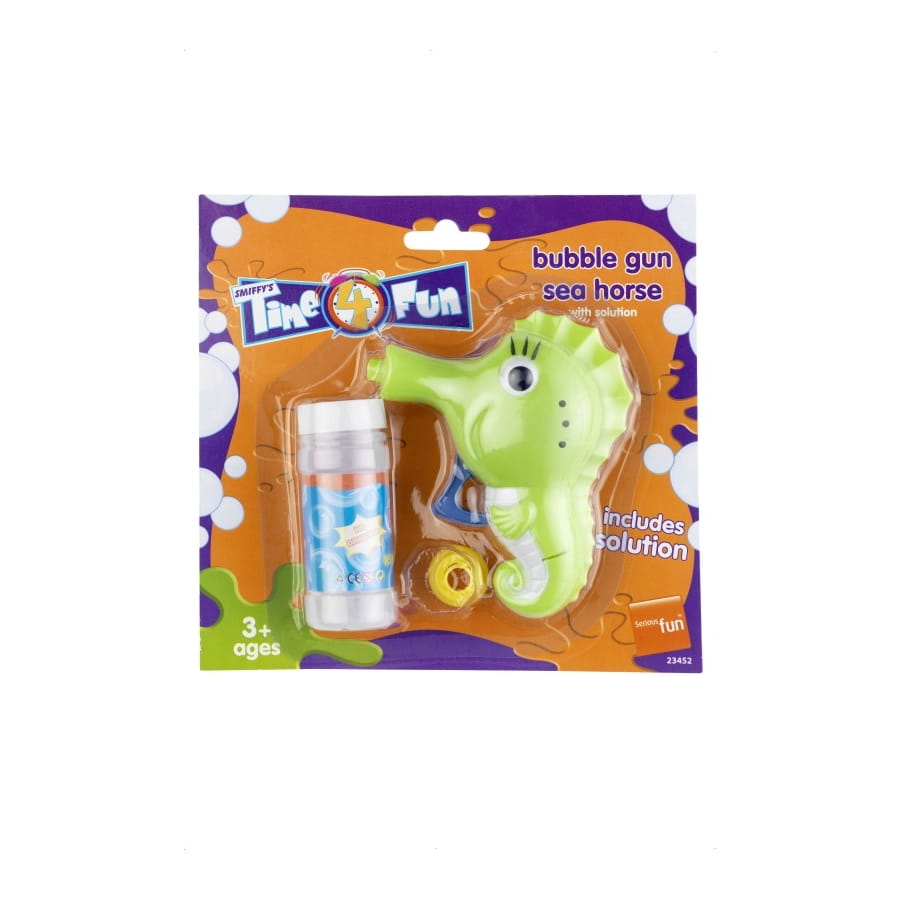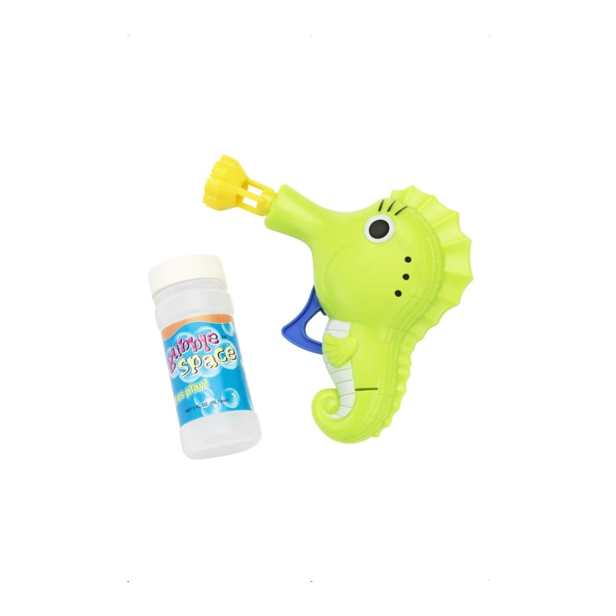 Pistolet à bulles, pour garçon ou fille, en forme d'hippocampe de couleur blanche, bleue, jaune et verte, livrée avec le flacon. Ce jouet plaira à tous les enfants grands ou petits! Il ne convient pas aux enfants de moins de 3 ans.