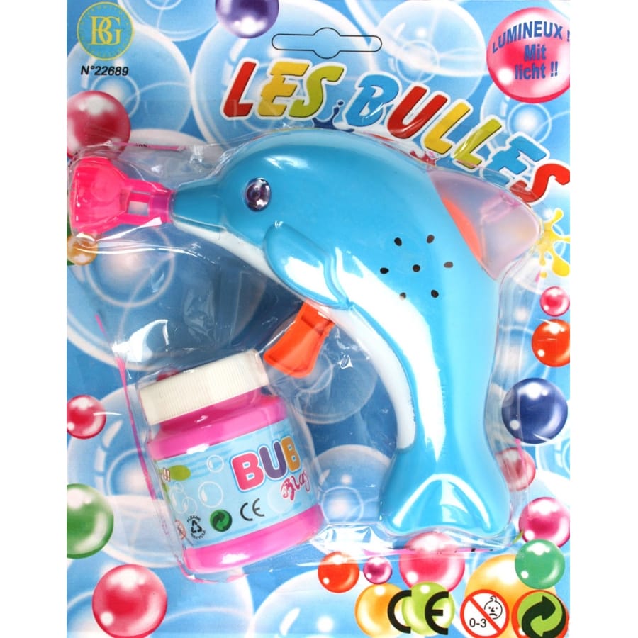 Ce jouet pistolet à bulles en forme de dauphin sera parfait pour votre enfant. Il va s'amuser a faire des bulles avec son nouveau jouet. Le dauphin a un bout lumineux, il fait 15 centimètre de couleur bleu. Il y a aussi un petit pot de savon pour faire les bulles avec. Ce jouet est livré avec deux piles.