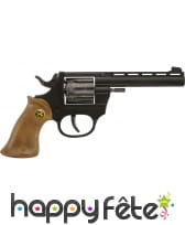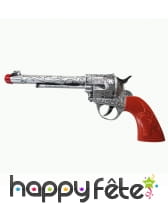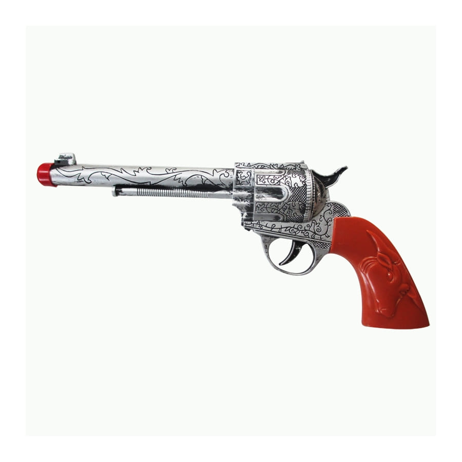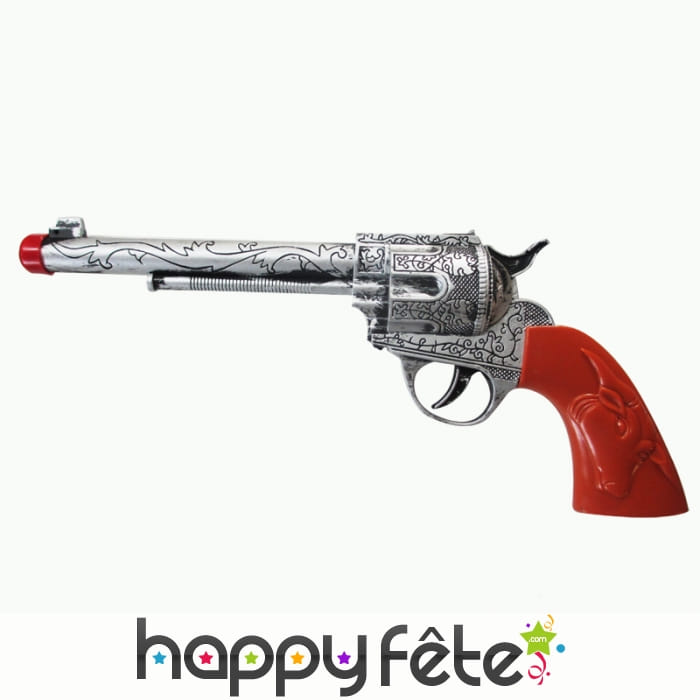Cet accessoire de déguisement Pistolet de cowboy argenté de 31 cm vous permettra d'incarner le rôle d'un cowboy lors de votre prochain événement déguisé. Idéal pour une fête sur le thème Western ou Action et Aventure, ce magnifique pistolet de cowboy en plastique offre un design très réaliste, avec un manche rouge très attrayant orné d'un motif cheval en relief, et un canon argenté.