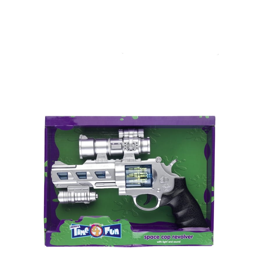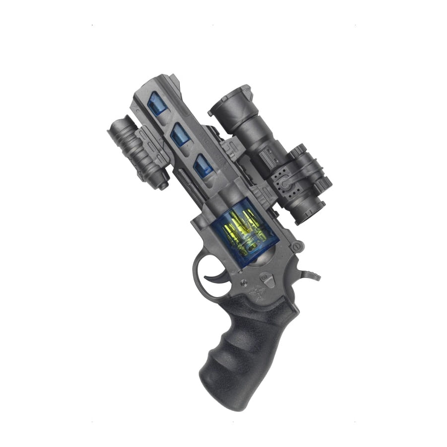 Pistoler futuriste, pour enfants. Le pistolet est de couleur argentée et noire, avec un viseur intégré sur le haut. Il sera idéal pour se transformer en personnage du futur ou de science-fiction.