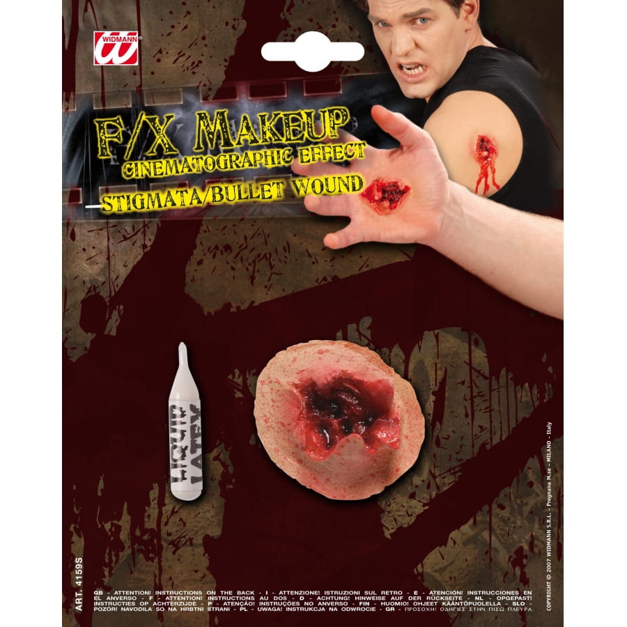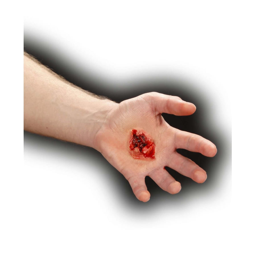 Kit de maquillage d'Halloween à effet cinématographique composé d'une plaie infectée et d'un pot de colle. Collez la plaie dans un endroit bien visible pour écoeurer vos amis.