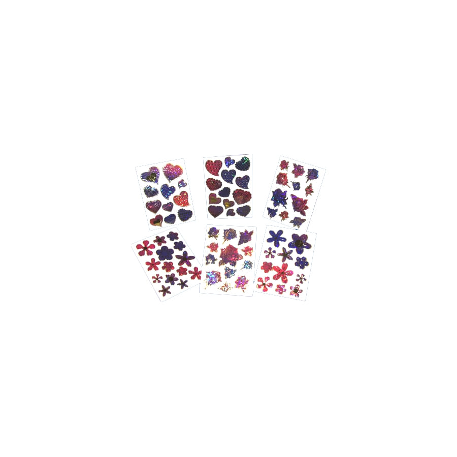 Planche de sitckers lasers assortis. Il existe des modèles de coeurs, de roses ou de fleurs. Chacune des planches mesure 8.5 centimètres de longueur sur 6 centimètres de largeur. Au moment de votre commande, il est impossible de choisir ni le modèle ni la couleur des planches. Vous recevrez une de celles présentées.