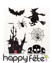 Il s'agit de: château hanté, chauve-souris, toiles d'araignée, sorcières, des araignées et têtes de morts.