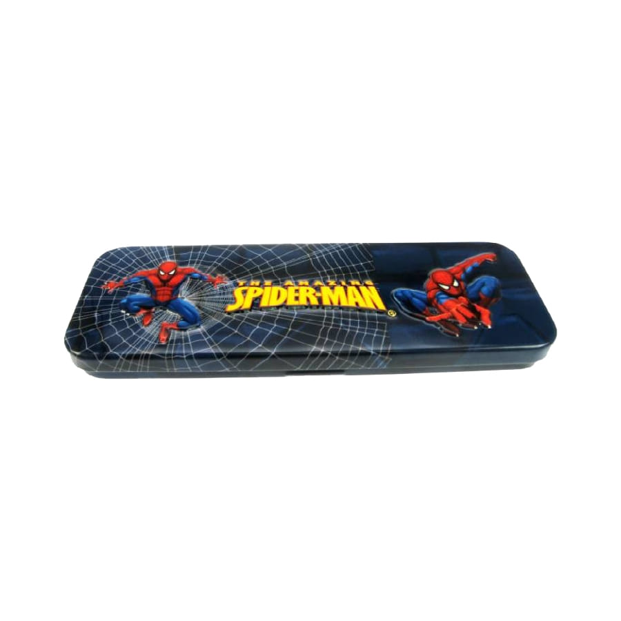 Plumier en métal 'Spiderman' sous licence. Imprimé de plusieurs dessins Spiderman et d'une toile d'araignée, ce plumier est de couleur bleue, jaune et rouge. Il mesure 19 centimètres de long, le rendant assez long pour y mettre vos plumes et crayons.
