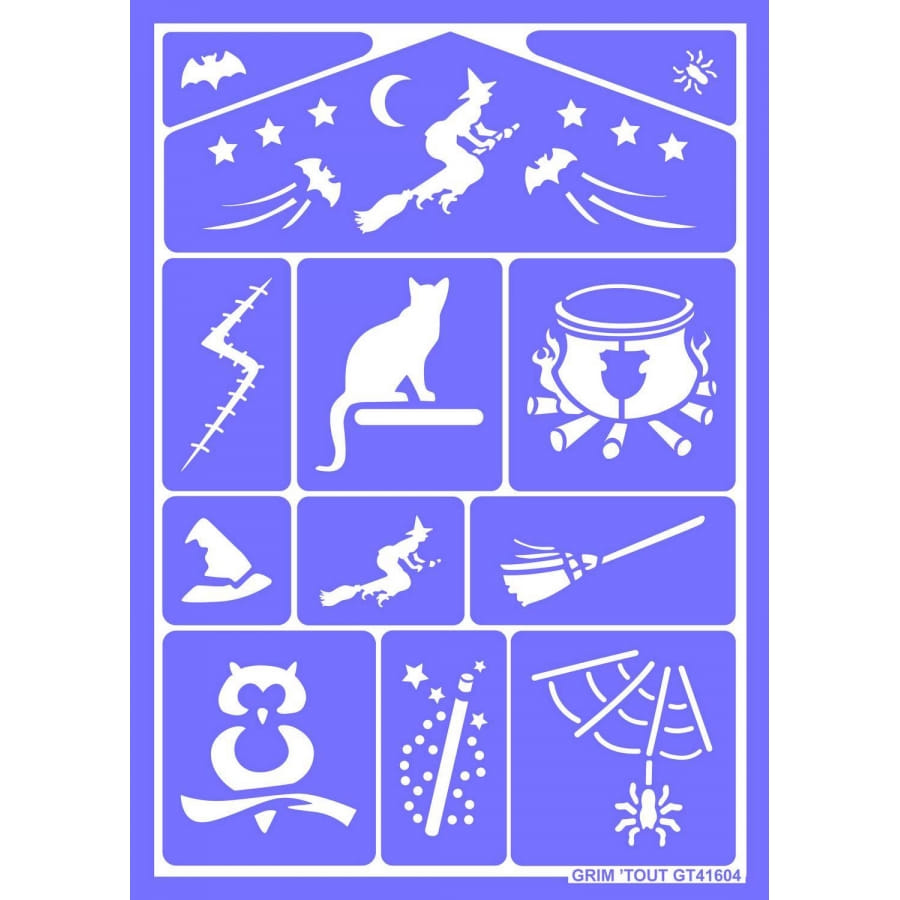 Il s'agit d'un accessoire qui représente un pochoir à multiples motifs qui servira de maquillage au visage pour accompagner un déguisement de sorcière.