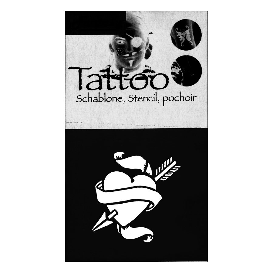 Pochoir tattoo en forme de coeur transpercé d'une flèche pour homme ou femme. C'est un accessoire parfait pour compléter un déguisement de biker, de gangster ou de rockeur. Le tattoo mesure 5 centimètres sur 6 centimètres.