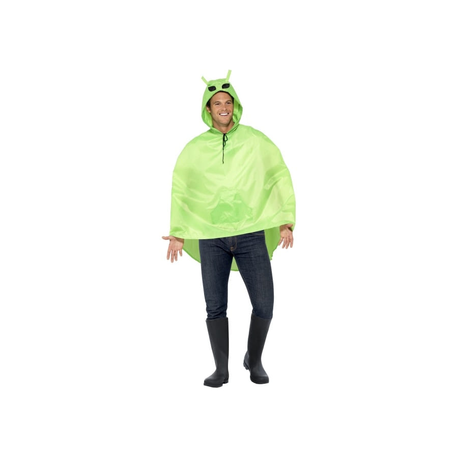 Quelquefois, il faut savoir choisir des déguisements pratiques, mais qui en même temps n'enfreignent pas le thème de la soirée à laquelle vous allez assister en un temps de pluie. Justement, nous avons à vous proposer ce poncho Alien imperméable, de couleur verte avec un sac attaché. Orné d'une capuche qui porte les yeux globuleux de couleur noire et les oreilles d'un Alien, ce costume vous permettra de vous protéger de la pluie et d'arriver sain et sauf à votre soirée à thème Halloween, extra-terrestre ou science-fiction avec le déguisement d'Alien idéal. De plus, ce poncho, qui est imperméable rappelons-le, peut être mis par un homme ou une femme, car la taille que nous proposons est une taille unique standard, idéale pour tous les adultes.