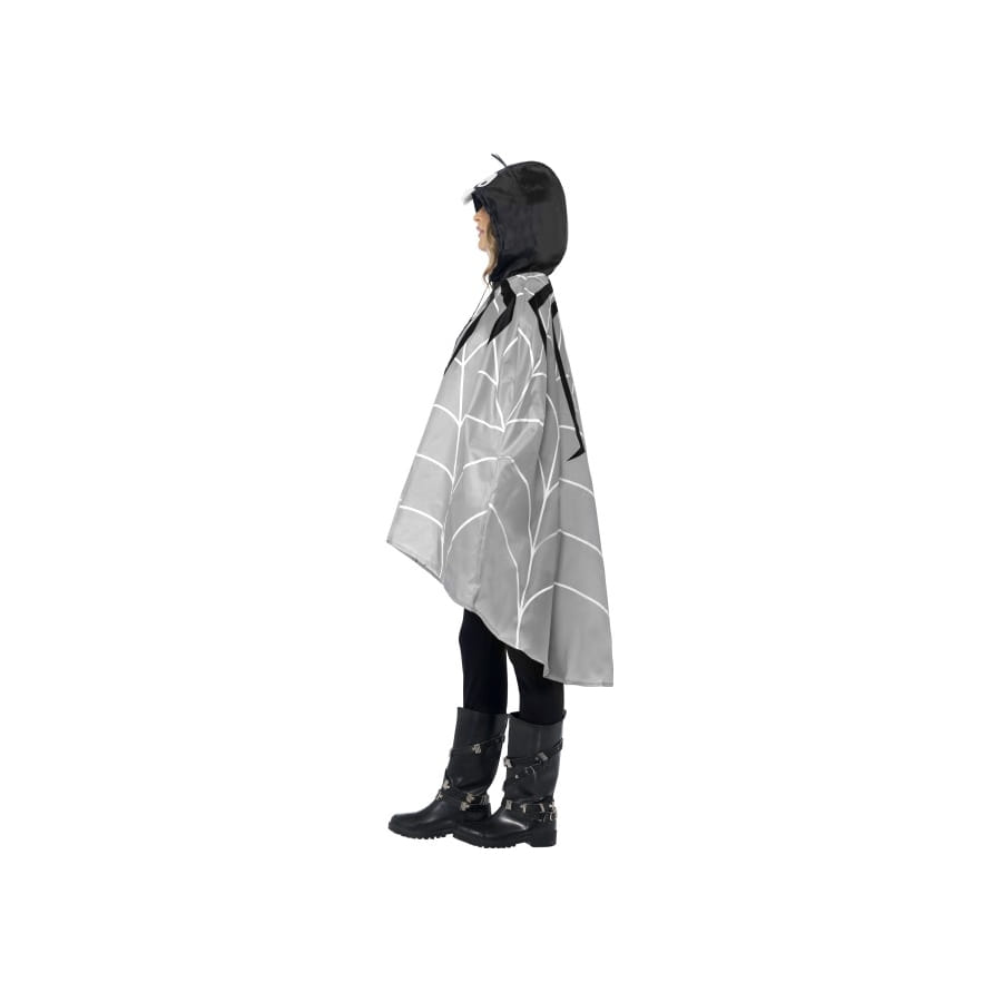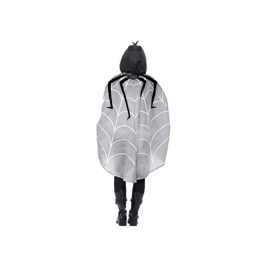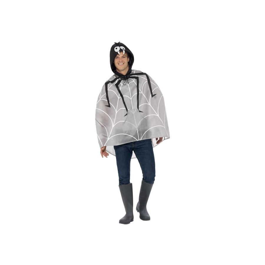 Pour Halloween, ou tout autre évènement déguisé, nous vous proposons cet imperméable hors du commun pour ne pas passer inaperçu. C'est un grand poncho gris à motifs toile d'araignée blanche, muni d'une capuche noire qui représente la petite tête de l'araignée. Cette capuche est imprimée des gros yeux blancs, ainsi que de deux grosses dents pointues. Les huit pattes d'araignée sont également visibles sur le poncho, quatre sur le devant, et quatre dans le dos. Elles sont de couleur noire. Notez que ce poncho est imperméable.