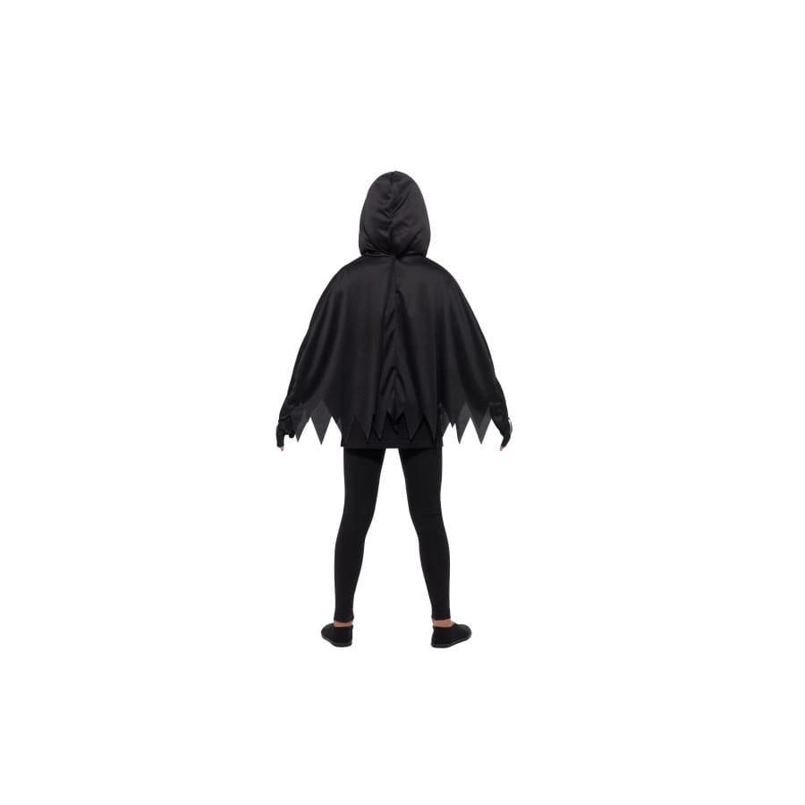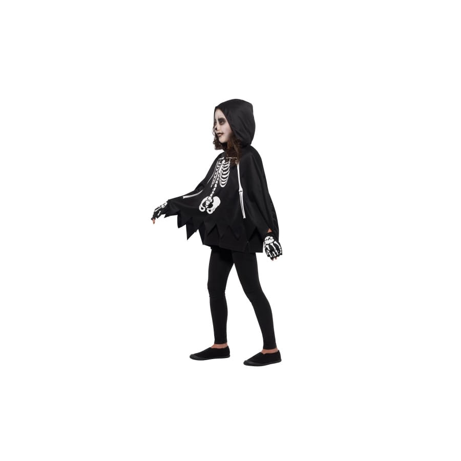 L'accessoire est composé d'un poncho noir, imprimé d'un squelette blanc et terminé en dents de scie, d'une paire de gants noir, présentant également une impression de squelette.