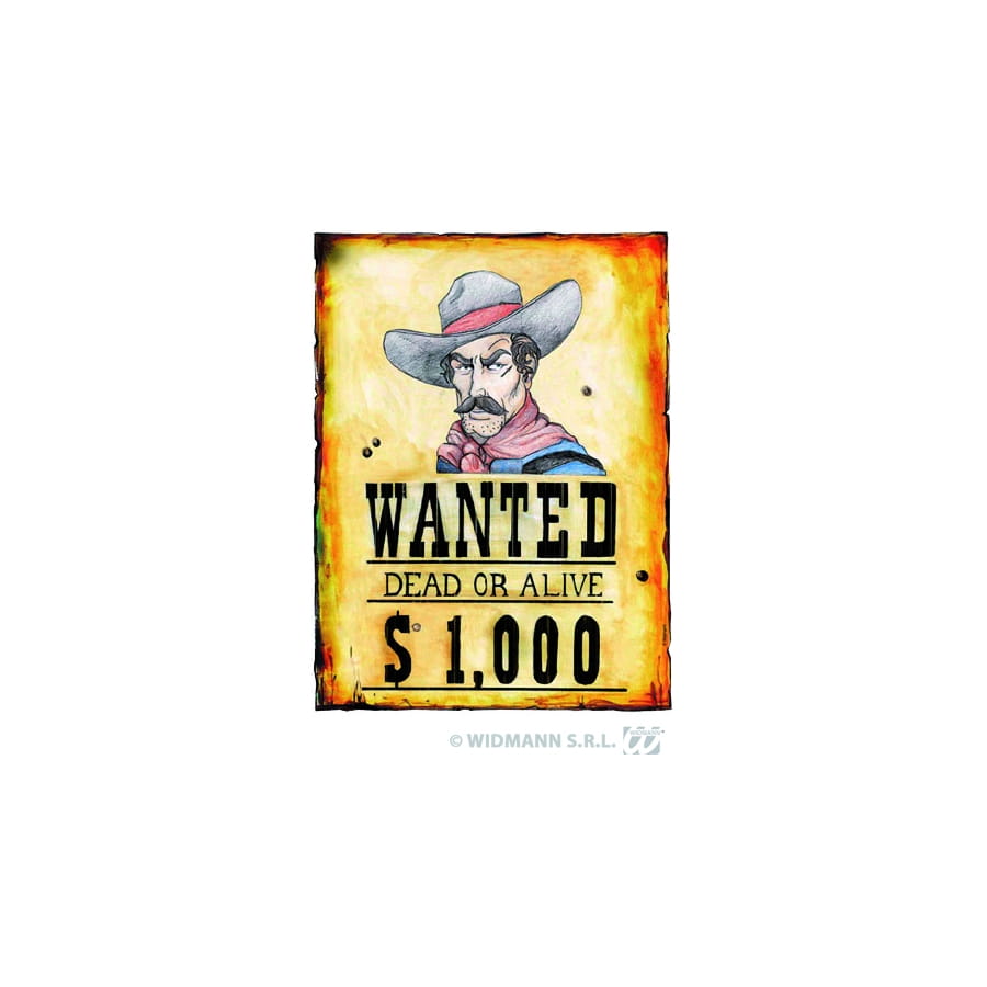 Pour la soirée western, ce poster est a sa place sur votre mur. Parfait aussi pour un anniversaire, décoration idéale pour un thème sur le western. Ce poster multicolore avec un homme portant un chapeau et il est écrit 'wanted dead or alive $1,000' en noir. Ce poster fait 38 cm de large sur une hauteur de 50cm.