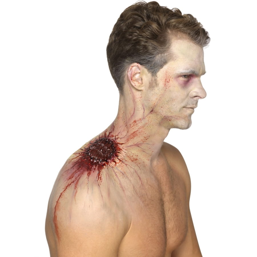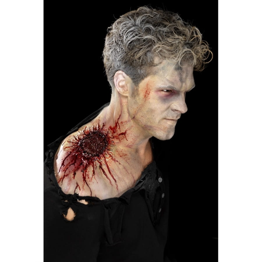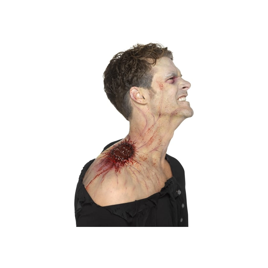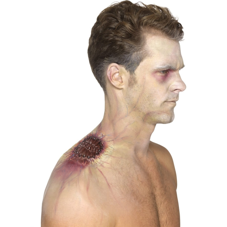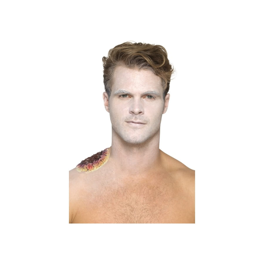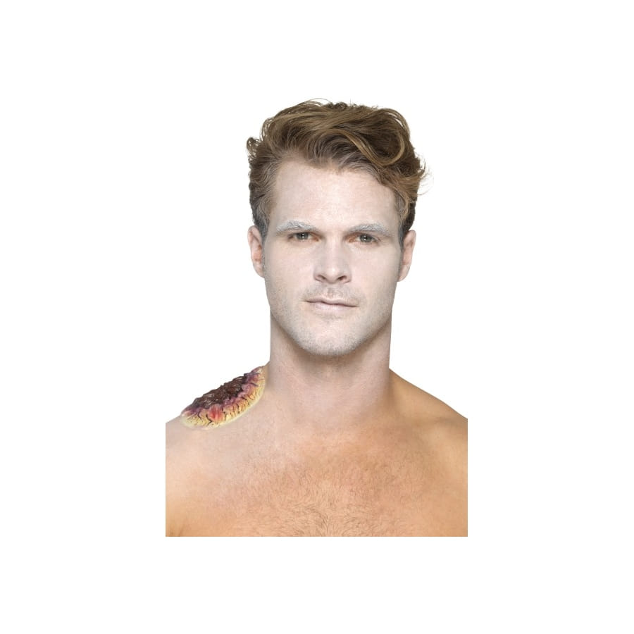 Inventez-vous une sale blessure pour accompagner votre déguisement d'halloween. La cosmétique unisexe postiche morsure infectée en latex accomplira cette fonction pour vous. Une fois bien placée sur votre peau à l'aide d'un système d'adhésif, elle donne un effet très réaliste. Elle imite une morsure d'animal ou de monstre qui s'infecte. Cette cosmétique de couleur rouge est conçue dans de la mousse de latex. Elle prend une couleur rouge mélangée à du noir, pour reproduire un caillot de sang.