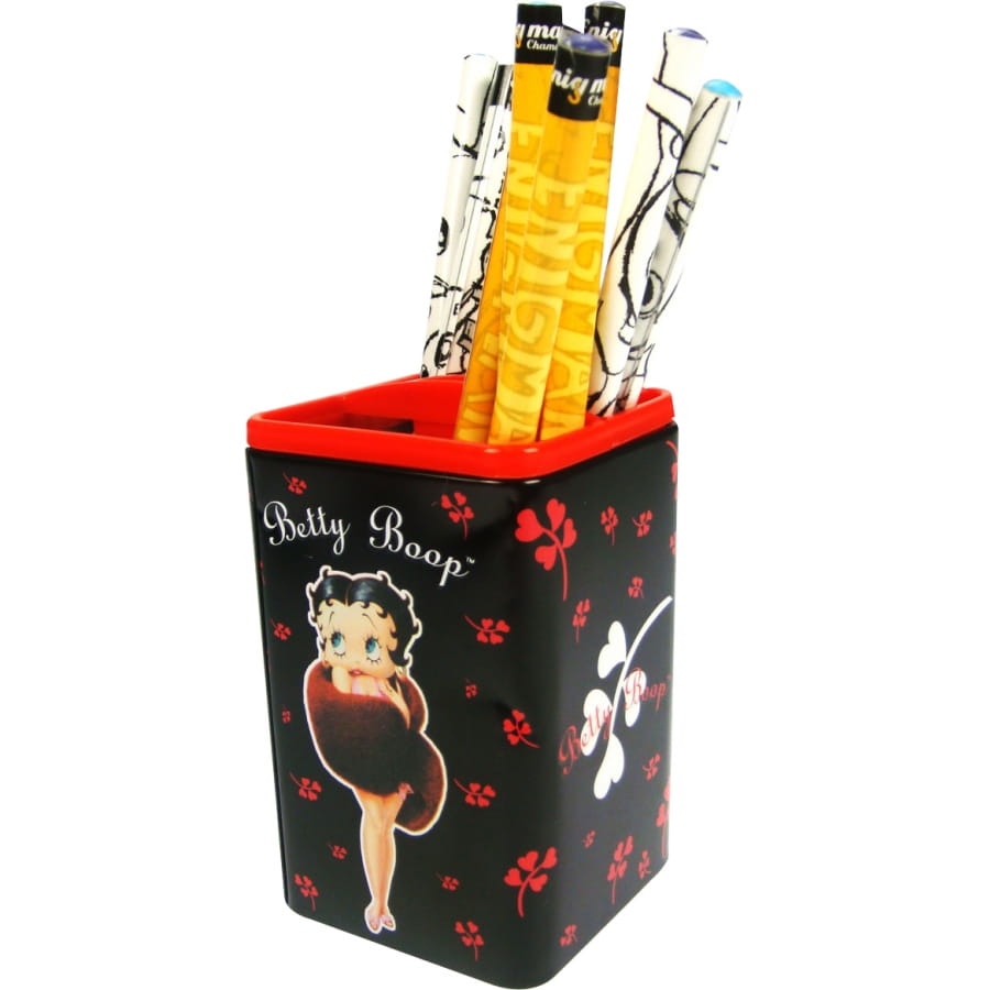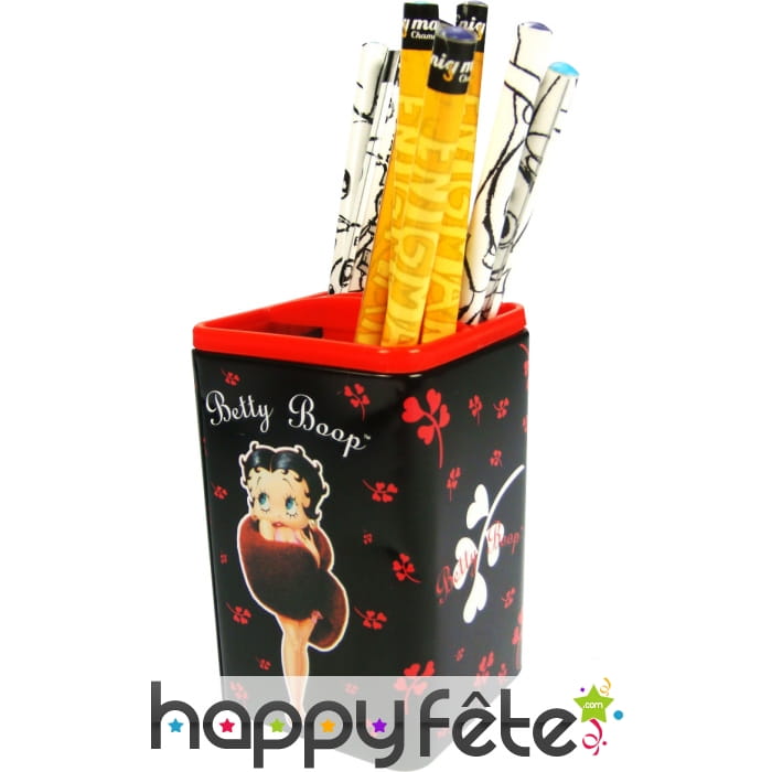 Ce pot à crayon sera magnifique sur le bureau de votre fille ou encore sur le votre. Il fait 7 centimètre de long, en forme de rectangle, il est noire avec le dessin de Betty Boop dessus et des motifs rouge. Le haut du pot à crayon est rouge. Il est vendu sans crayons.