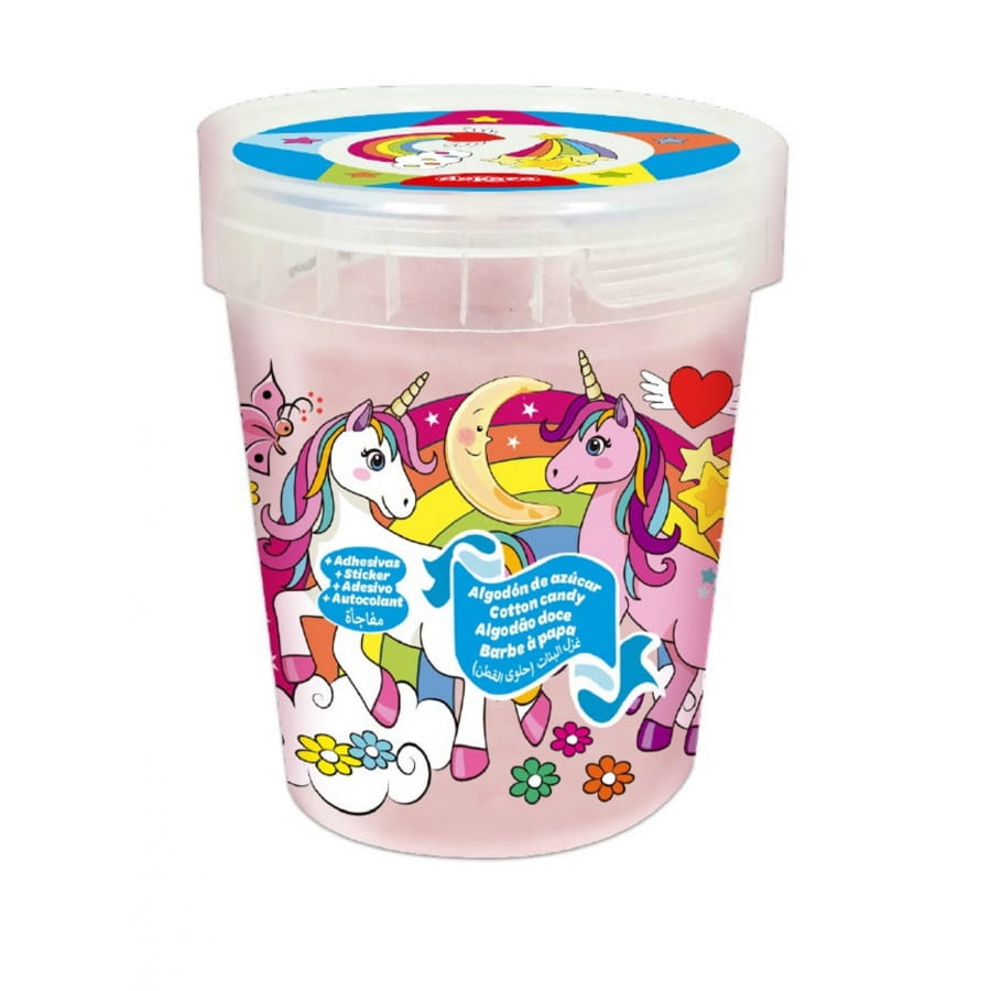 Pour une fête haute en couleur, ce Pot de barbe à papa rose avec autocollants licorne sera parfait.