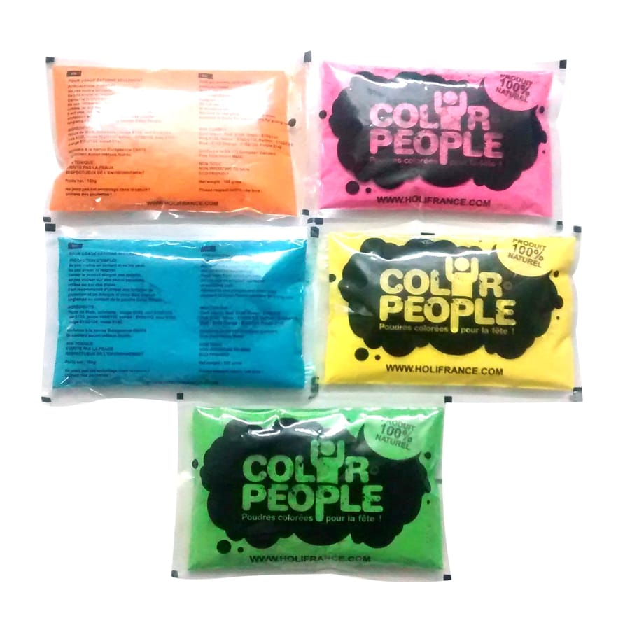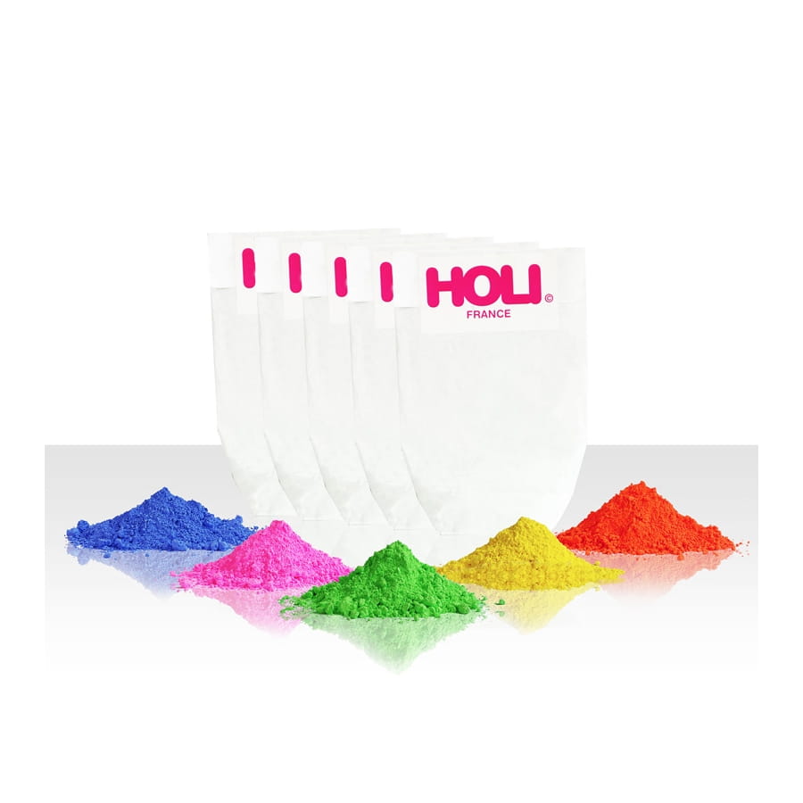 La vie en couleurs ! En utilisant ces poudres colorées HOLI, vous vous créerez un festival ou un mariage avec une ambiance inoubliable et super amusante. Ces poudres sont présentées en pack de 1 kg composé de 10 sachets de 100 g et en pack de 5 kg avec 50 sachets de 100 g. 5 coloris sont disponibles : bleu, jaune, rouge, vert fluo et rose fluo, etc. Elles sont particulièrement idéales pour les fêtes en pleine air. D'ailleurs, la poudre Holi est fabriquée à base d'éléments biodégradables et de colorants alimentaires, donc, il n'y aura aucun risque pour la santé et l'environnement à l'utiliser. Pas le choix des couleurs au moment de la commande.