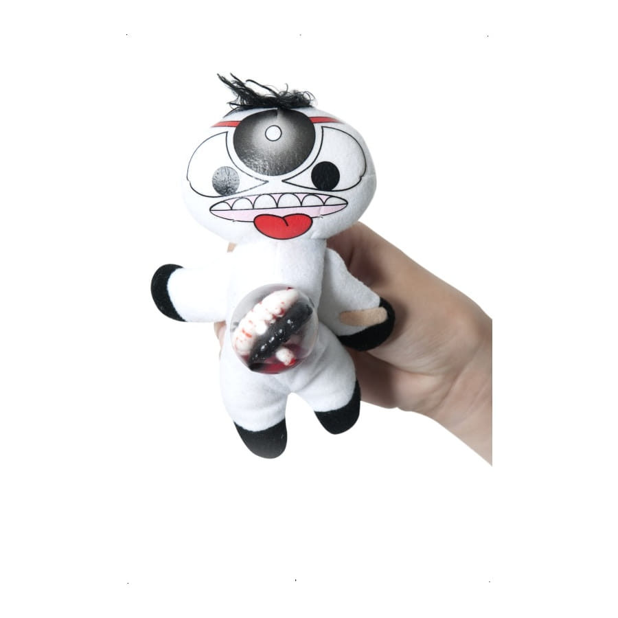 Poupée à secouer représentant un docteur maléfique de couleur blanche, noire et rouge. Cette poupée peut servir d'anti-stress ou de décoration pour Halloween, selon votre choix.