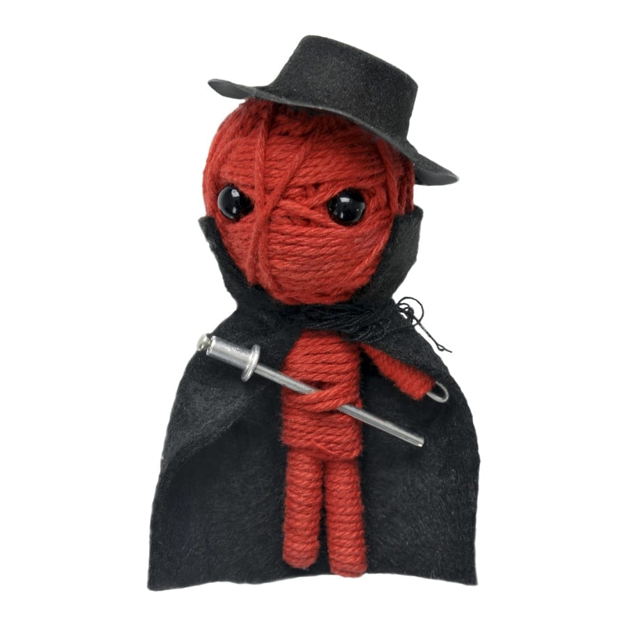 Petite poupée voodoo de couleur noire et rouge. Elle représente "El Bandito", avec une cape noire et une petite épée argentée. Utilisez ce petit accessoire comme décoration d'Halloween.