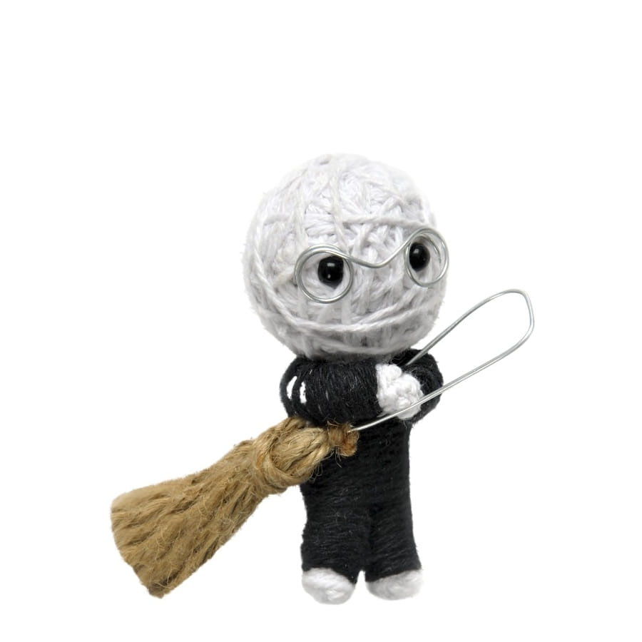 Cette poupée ficelle sera parfait comme décoration pour Halloween, vous pourrez aussi l'offrir. Cette poupée est en ficelle, sa tête est de couleur blanche avec des lunettes grise, les vêtements sont noir et la poupée tient dans sa main un balai marron.