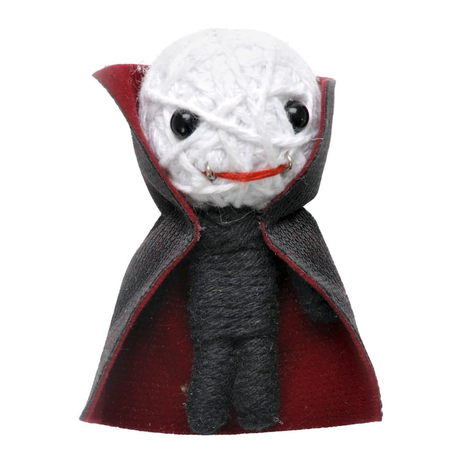 Poupée en laine de couleur blanche, rouge et noire, avec cape assortie. La poupée représente un petit vampire innoffensif aux lèvres rouges. Cette poupée pourra vous servir d'accessoire pour une fête déguisée ou tout simplement comme petit souvenir.