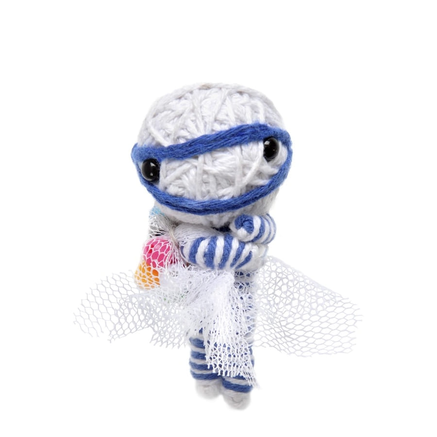 Petite poupée voodoo en ficelle de couleur blanche et bleue. Cette poupée représente un voleur avec un filet entre les mains. C'est un petit accessoire très utile comme décoration.