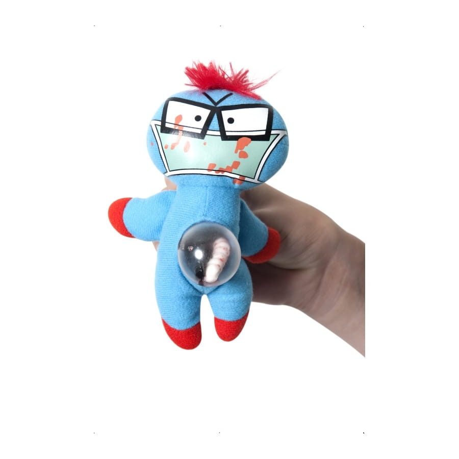 Poupée Docteur Maléfique de couleur bleue et rouge. Cette poupée est secouable et maléable. En la comprimant, vous ferez sortir son ventre et pourrez apercevoir le contenu de son ventre transparent.