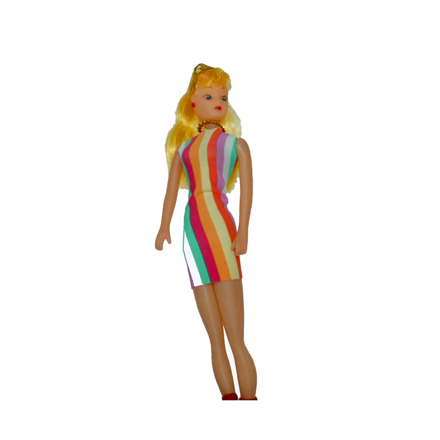 Vous pourrez offrir cette magnifique poupée a votre fille ou encore comme présent a une petite fille. Cette jolie poupée mannequin fait 26 centimètre de long. Elle est blonde avec un collier autour de son cou, elle porte une robe sans manche, courte avec des bottes dans ses pieds.