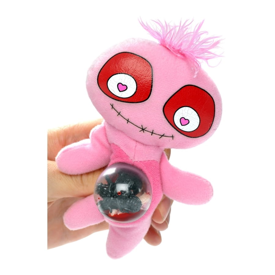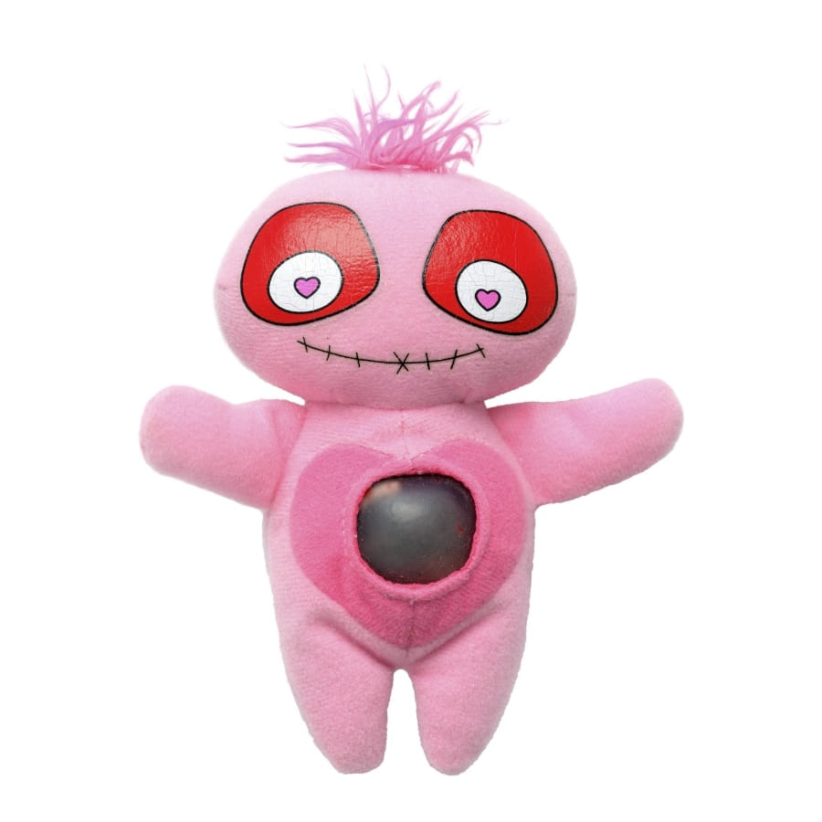Poupée monstre souple de couleur rose pour enfants. Cette jolie petite poupée possède des yeux rouges et une touffe de cheveux roses. En la comprimant, vous ferez sortir son ventre et verrez ce qu'il contient.