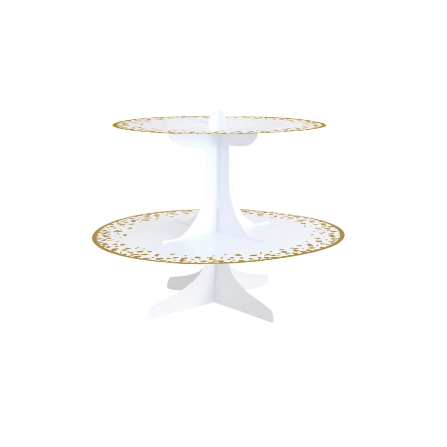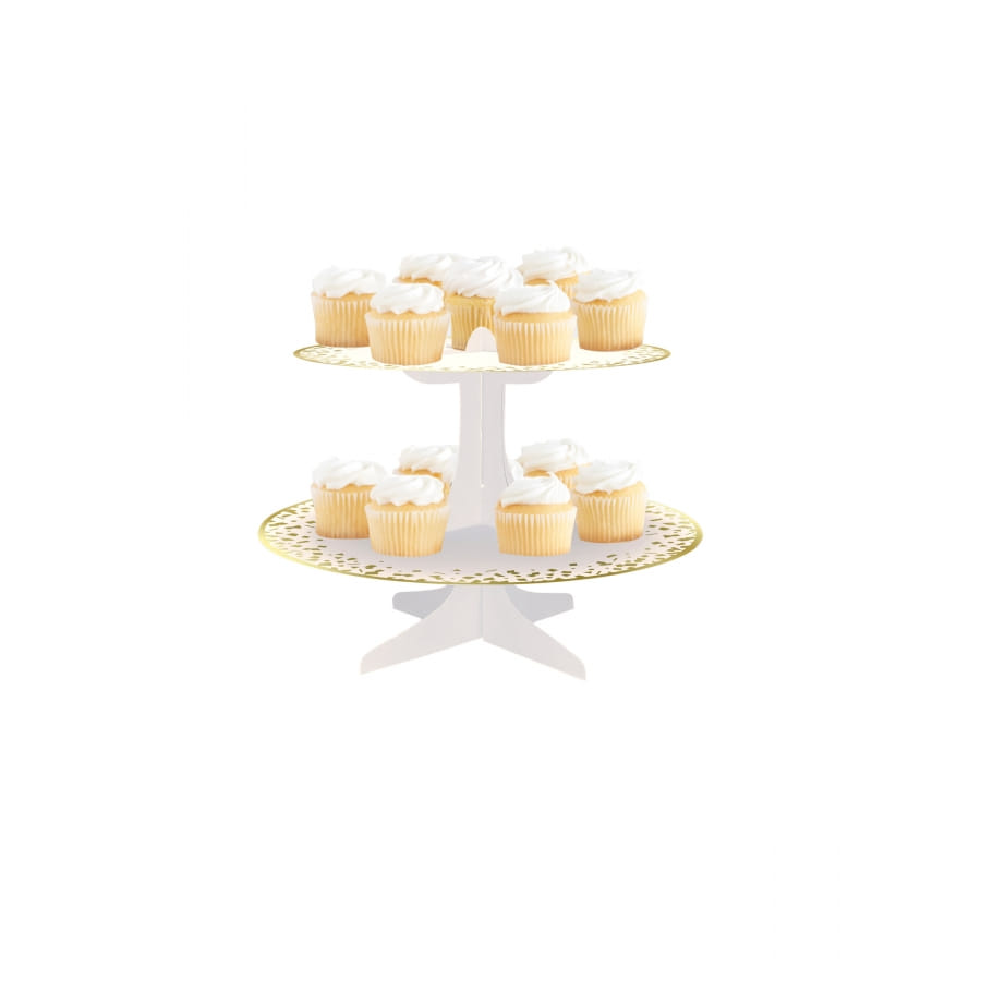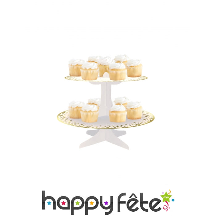 A l'occasion de votre prochaine soirée d'anniversaire, de noël ou de naissance, offrez le meilleur de la déco avec le présentoir blanc et doré en carton, pour cupcakes.