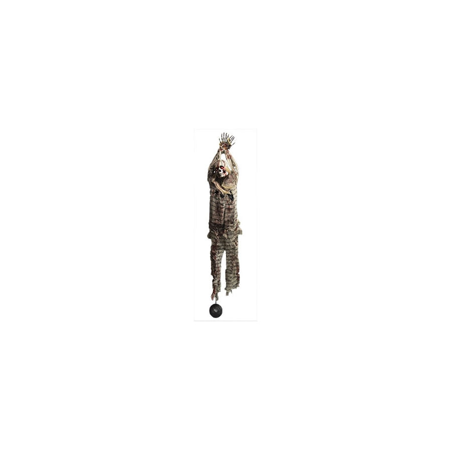 Fait en plastique, ce squelette amovible est recouvert d'une tenue effet usée de prisonnier.