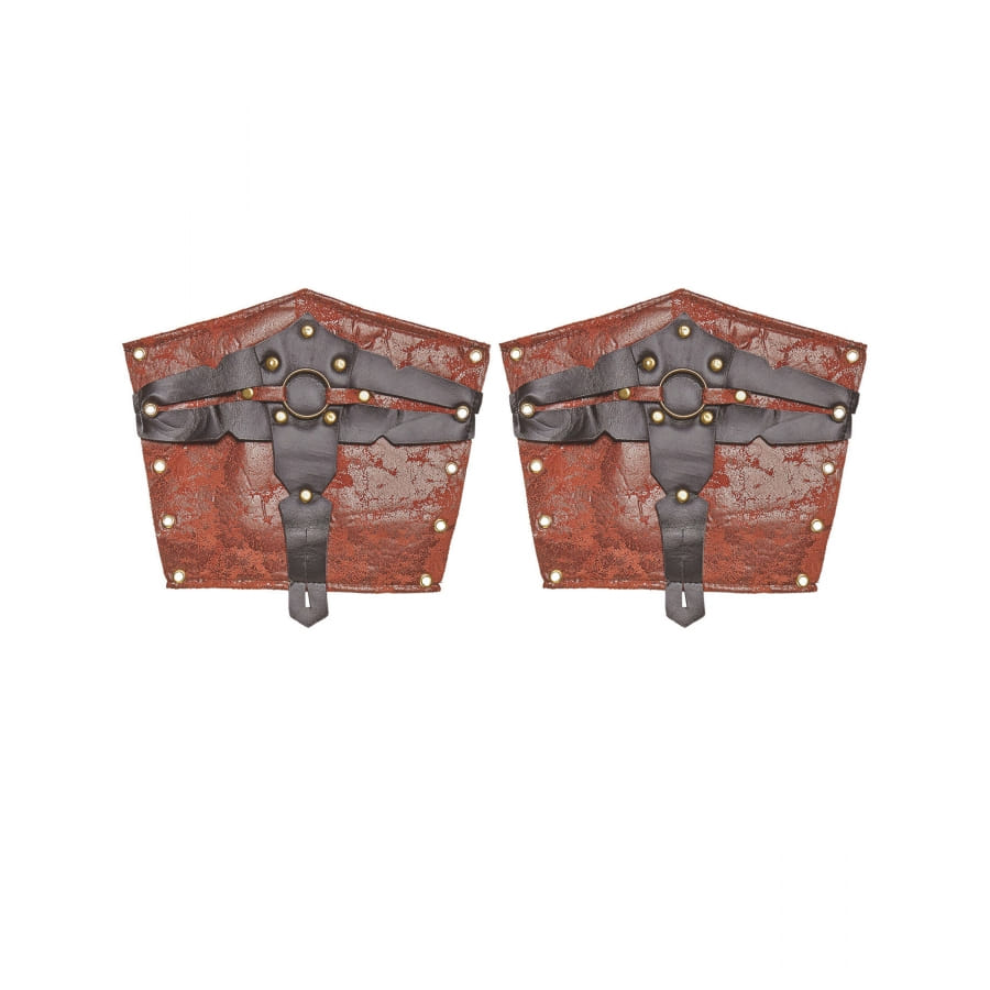 Ces protège mollets style cuir, sont marron et possèdent des lanières noires.