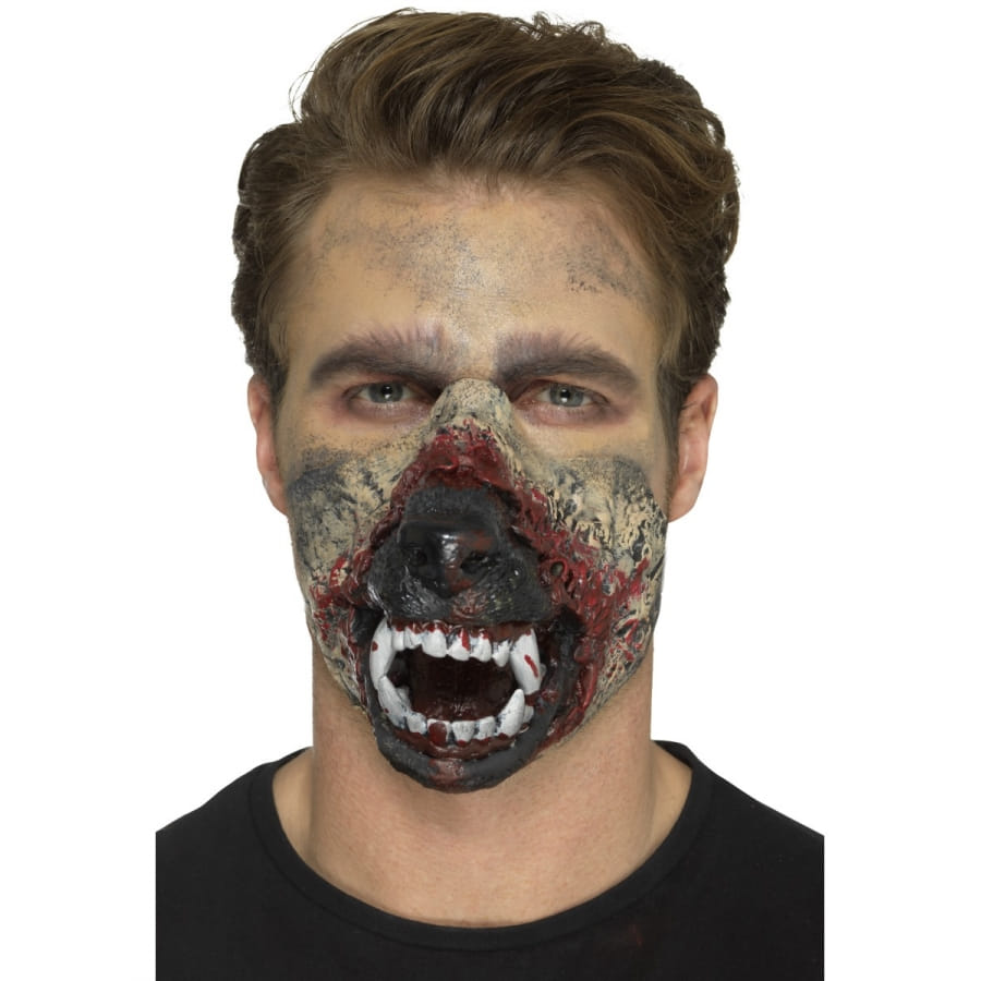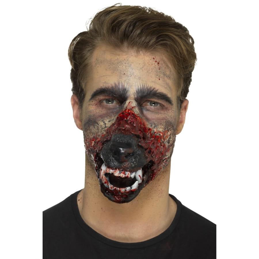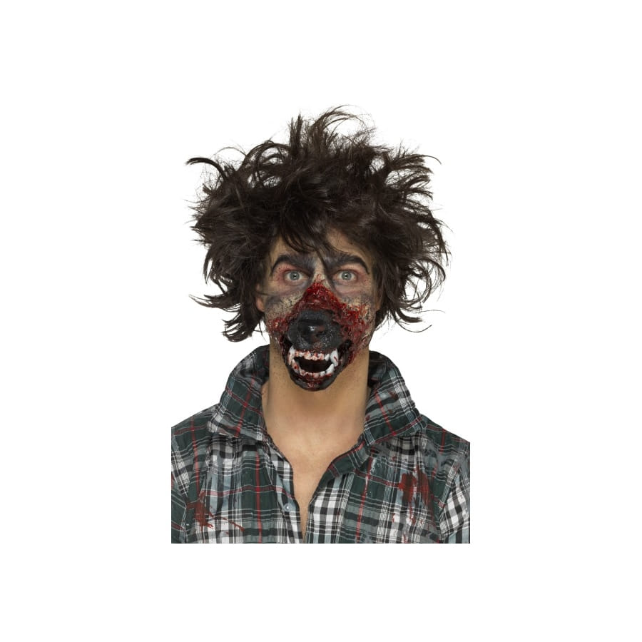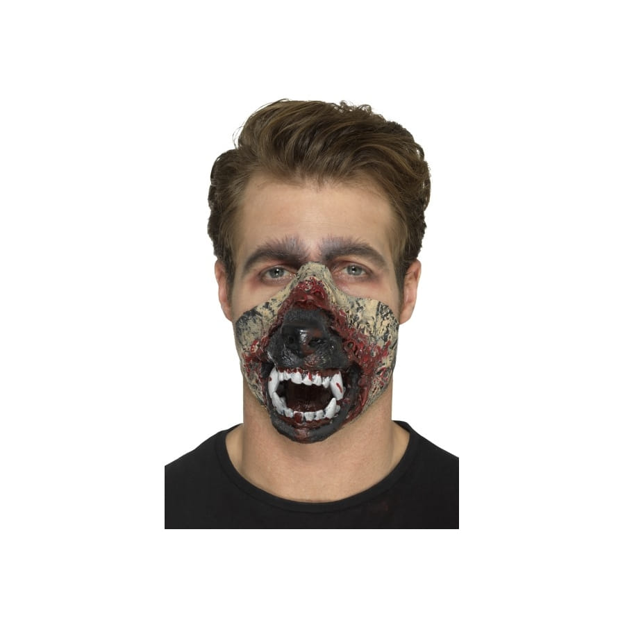 Une transformation se doit d'être complète pour halloween. Dans ce cas, si vous souhaitez vous déguiser en loup garou, ne faites pas les choses à moitié. Nous vous proposons la prothèse bouche de loup garou en mousse de latex qui se rattache au visage grâce à un système d'adhésif inclus. Cette gueule de couleur marron se trouve pourvu de crocs blancs et pointus. Sous cette cosmétique unisexe en mousse de latex, vous serez méconnaissable !