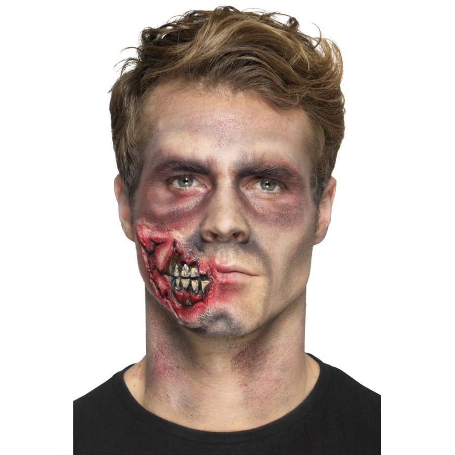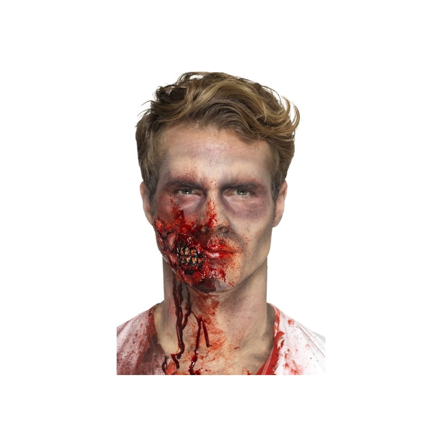 Insistez sur les détails pour votre déguisement de zombie grâce à la prothèse mâchoire joue de zombie en latex. Elle ressemble à la moitié d'une mâchoire rouge, pourvue de dents blanches. Très ensanglantée, elle donne l'impression que la peau du visage a été arrachée. Cette cosmétique destinée aux hommes, tout comme aux femmes, s'accroche sur la joue à l'aide d'un adhésif pour plus de réalisme.