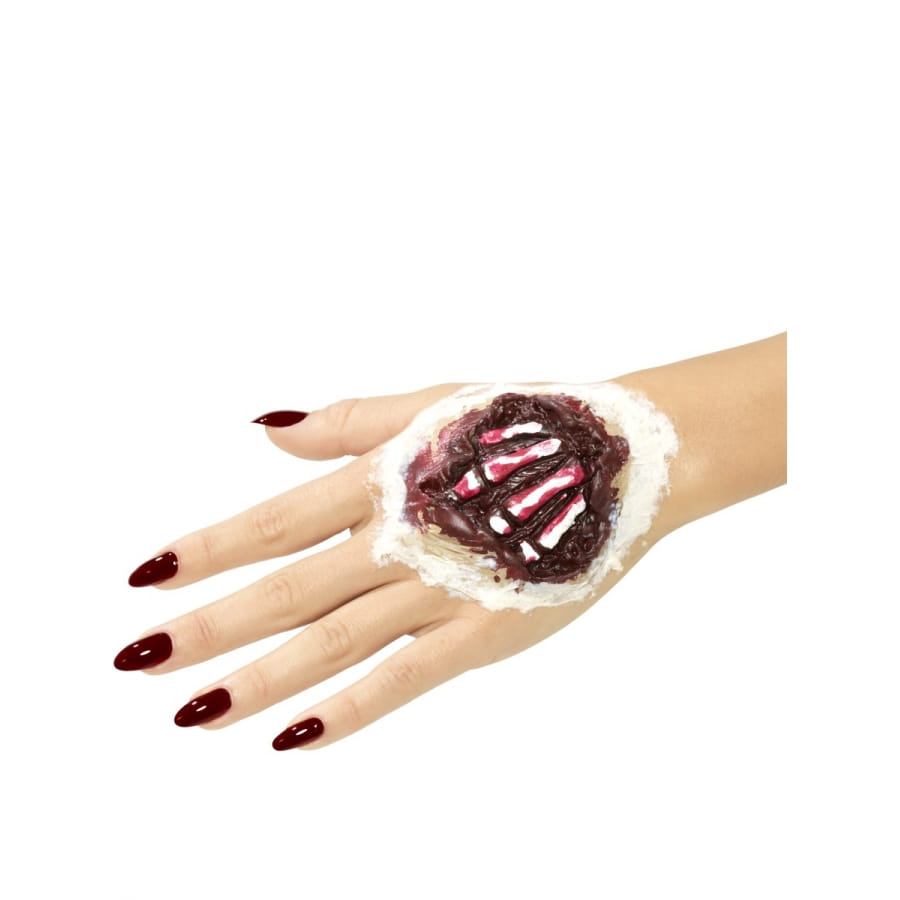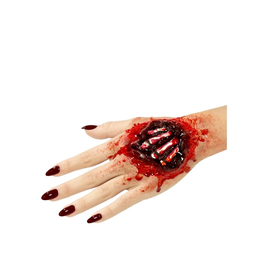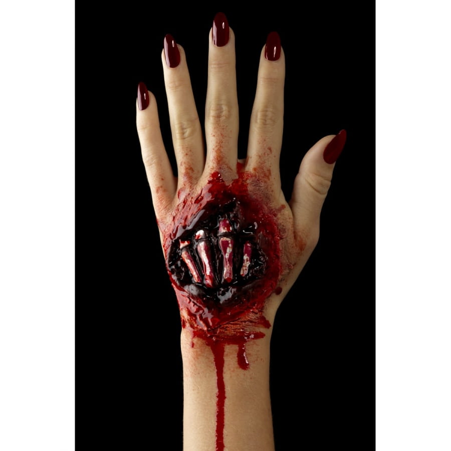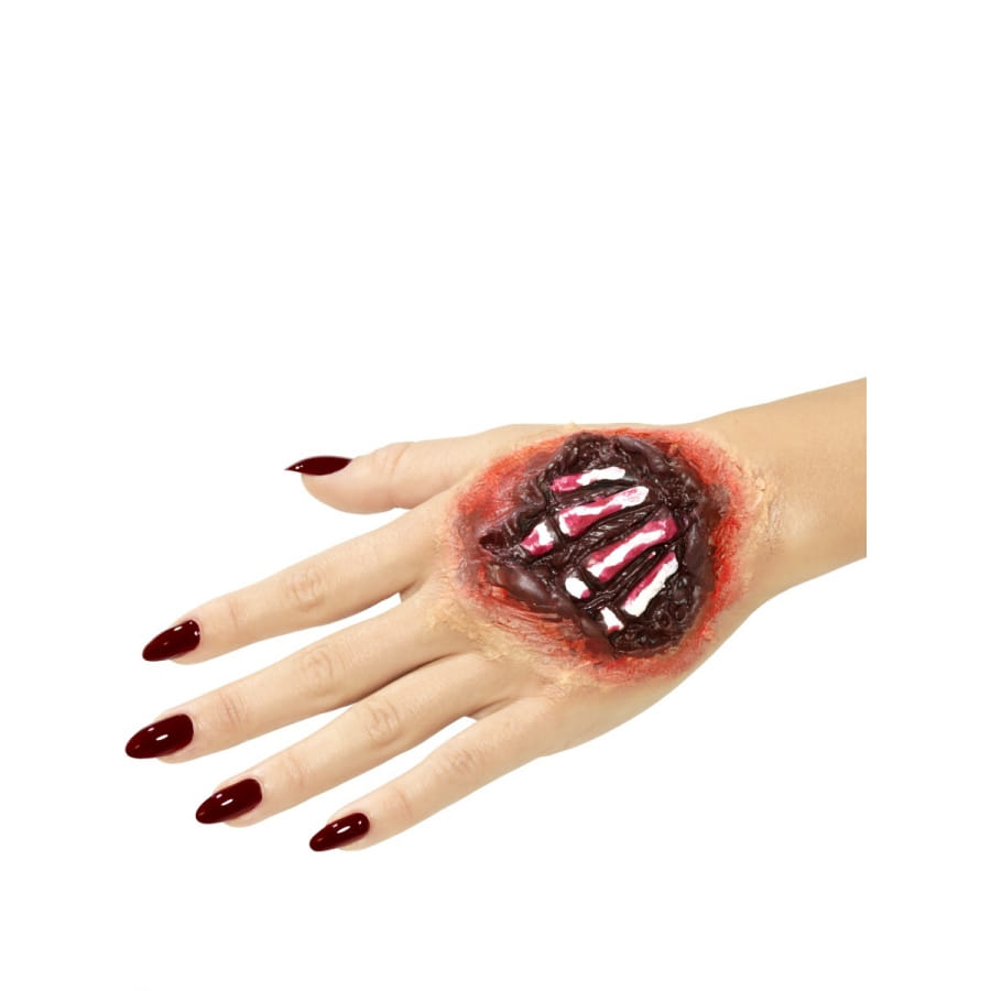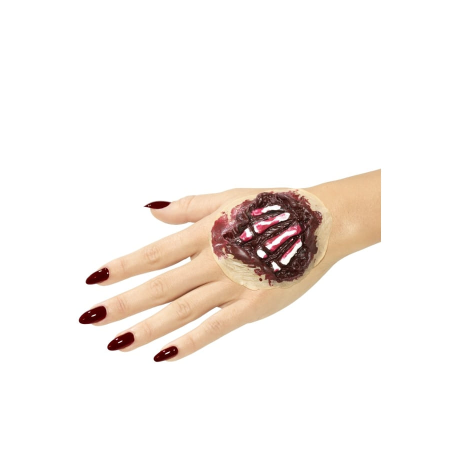 La prothèse os de la main visibles en latex correspond à une cosmétique sous le thème d'halloween. Elle reproduit de façon très réaliste une blessure ouverte au niveau de la main, laissant apparaître les os. Elle se fixe sur le revers de la main à l'aide d'un système d'adhésif incorporé. La lésion de couleur rouge sang donne la chair de poule avec le petits os blancs qu'elle laisse entrevoir. A commander absolument pour un déguisement réussi !