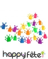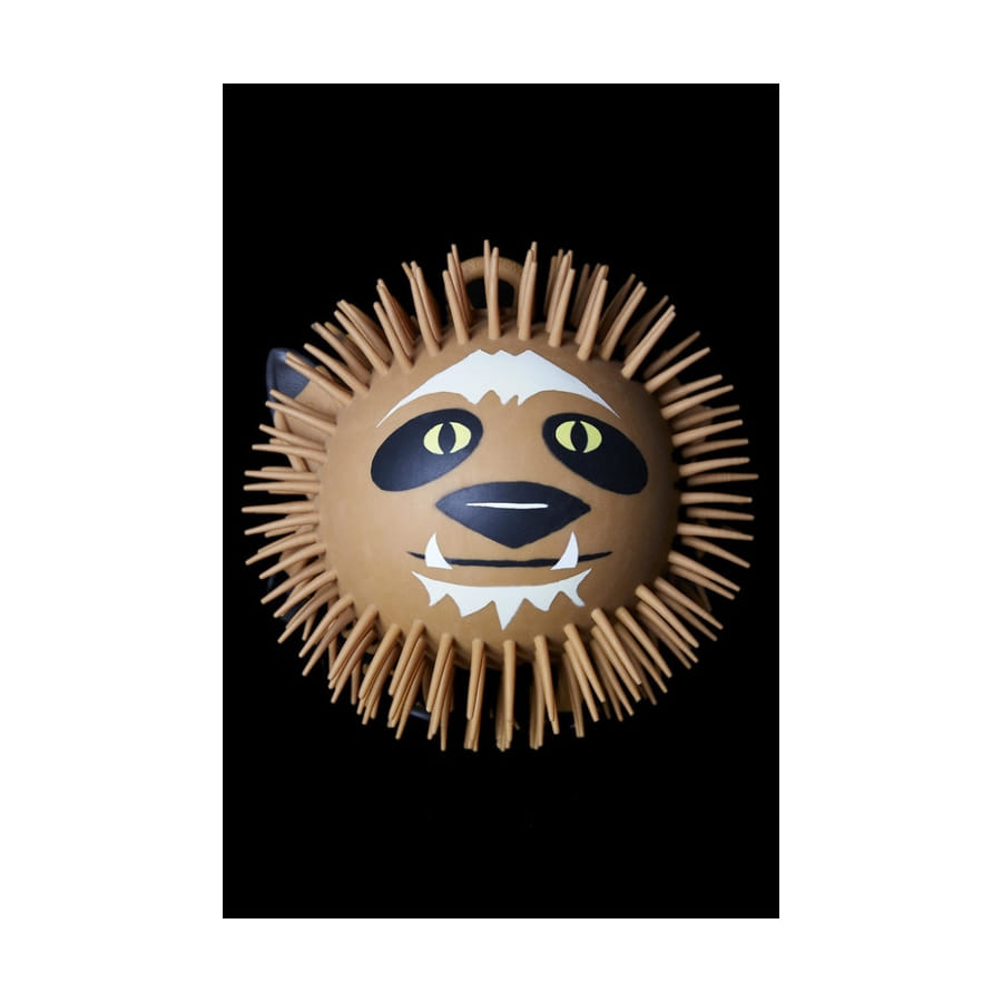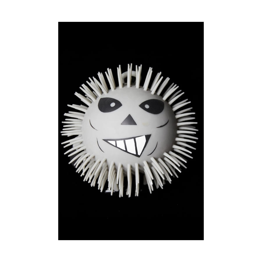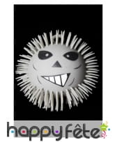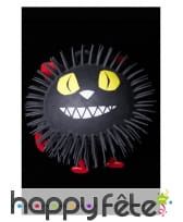 Sur sa surface sont imprimés les motifs noirs d'un visage de monstre sur un fond coloré.