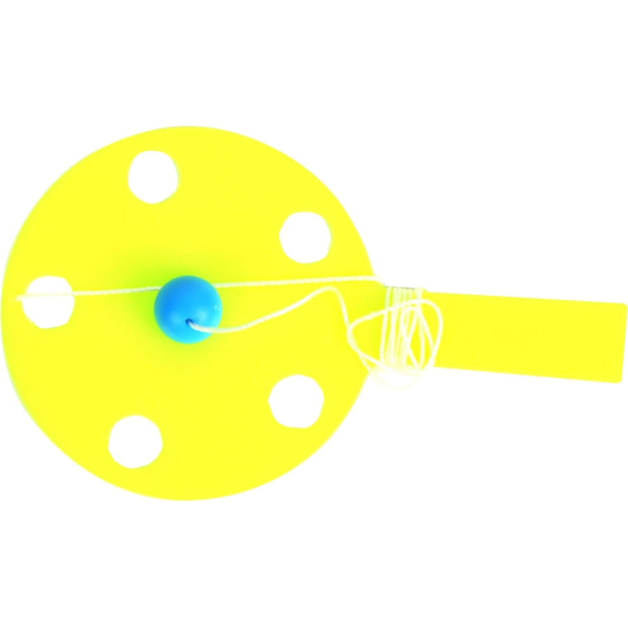 Vous pouvez offrir ce jeu a un enfant ou encore a vous même. Ce jeu de patience fait 14 centimètre. Il est de couleur jaune avec des ronds blanc dessus, il y une petite balle bleu attachée a la raquette.